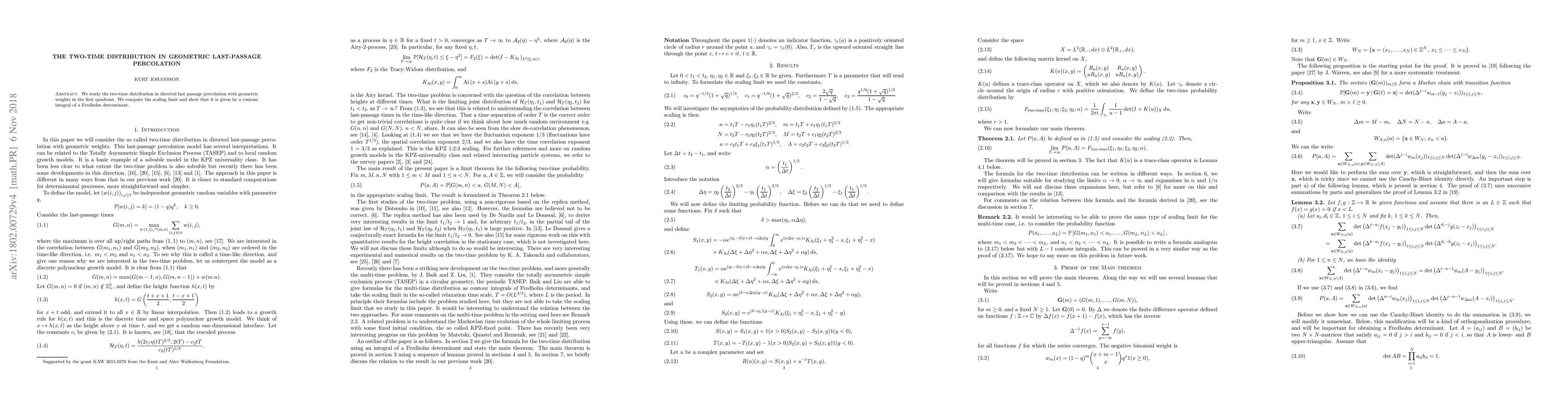 Summary: This paper investigates the two-time distribution in geometric last-passage percolation, determining its scaling limit, which is expressed as a contour integral of a Fredholm determinant. The results provide insight into the probabilistic behavior of the model.