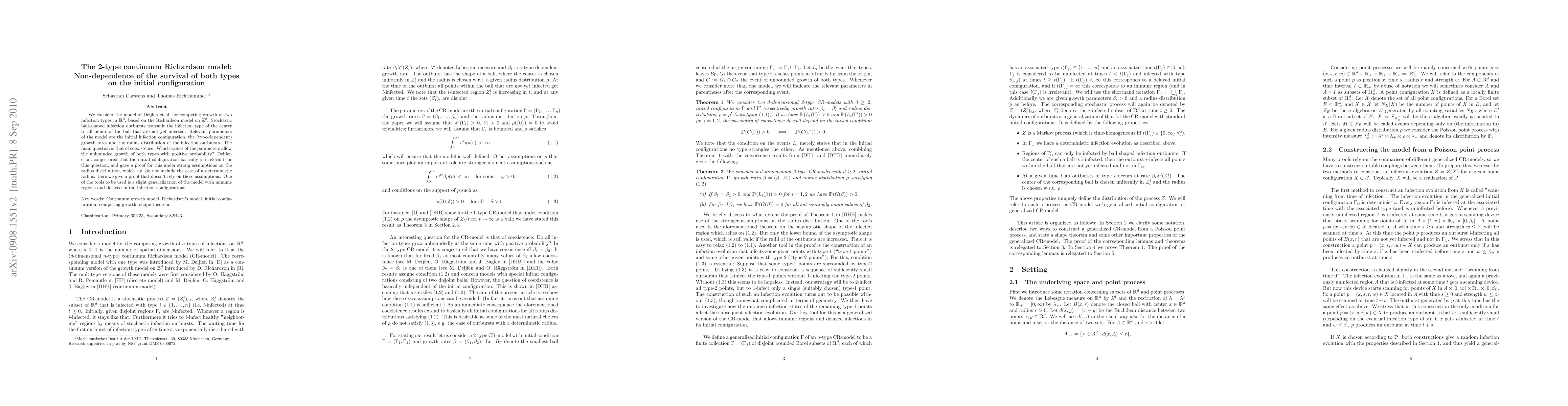 We consider the model of Deijfen et al. for competing growth of two infection types in R^d, based on the Richardson model on Z^d. Stochastic ball-shaped infection outbursts transmit the infection type of the center to all points of the ball that are not yet infected. Relevant parameters of the model are the initial infection configuration, the (type-dependent) growth rates and the radius distribution of the infection outbursts. The main question is that of coexistence: Which values of the parameters allow the unbounded growth of both types with positive probability? Deijfen et al. conjectured that the initial configuration basically is irrelevant for this question, and gave a proof for this under strong assumptions on the radius distribution, which e.g. do not include the case of a deterministic radius. Here we give a proof that doesn't rely on these assumptions. One of the tools to be used is a slight generalization of the model with immune regions and delayed initial infection configurations.