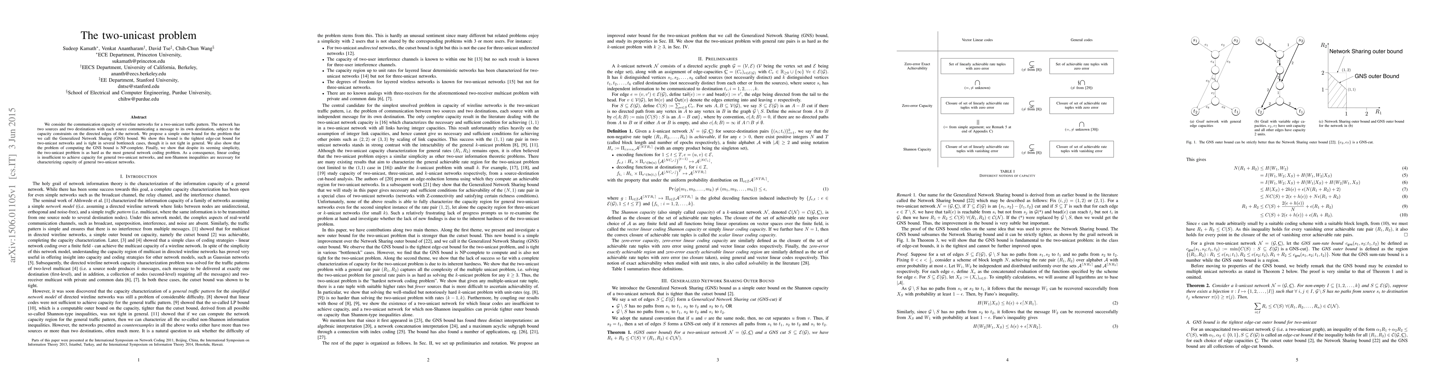 This paper investigates the communication capacity for two-unicast traffic in wireline networks, proposing a Generalized Network Sharing (GNS) bound that is the tightest edge-cut bound for such networks. It concludes that the two-unicast problem is NP-complete and as hard as the general network coding problem, indicating that linear coding is insufficient and non-Shannon inequalities are needed for capacity characterization.
