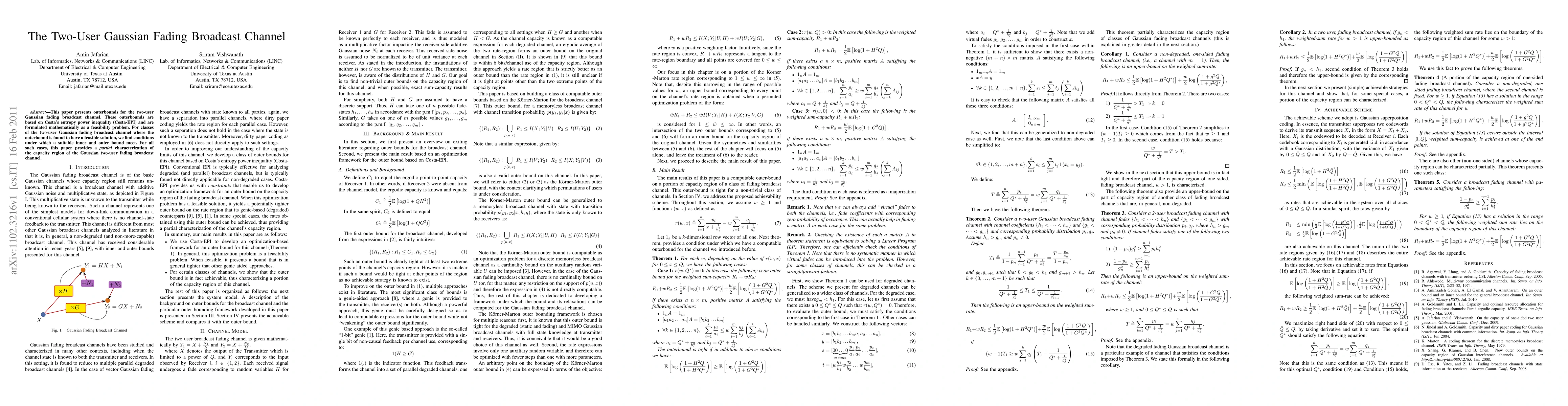 This paper develops outerbounds for the two-user Gaussian fading broadcast channel using Costa's entropy power inequality, achieving a partial characterization of its capacity region where feasible solutions exist.