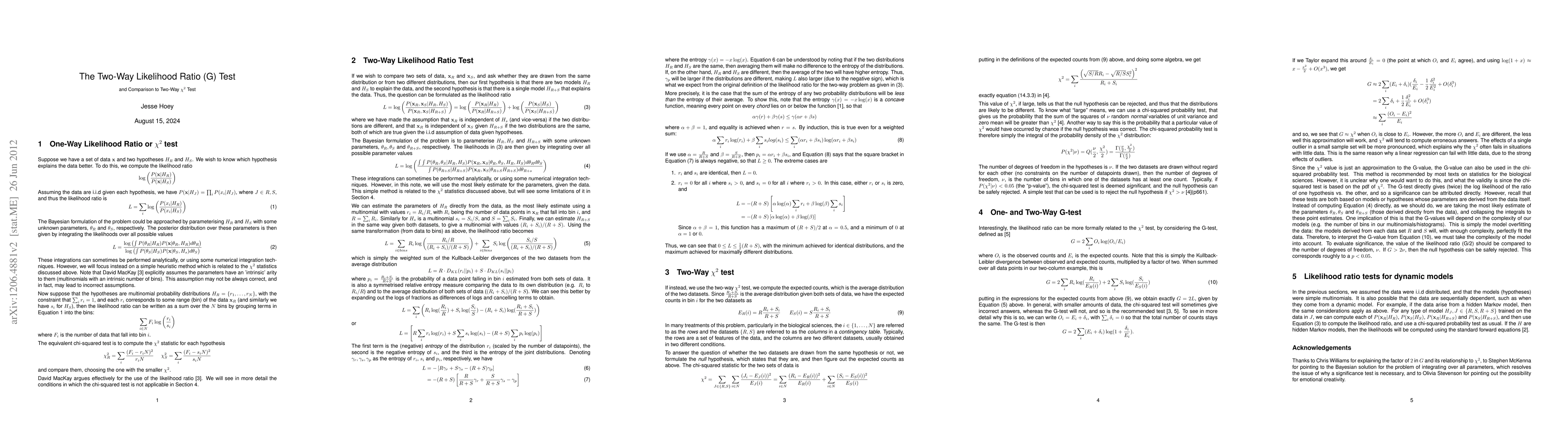 Summary: This paper derives the Two-Way Likelihood Ratio (G) Test and compares its performance to the Two-Way Chi Squared Test, providing insights into their relative effectiveness in analyzing categorical data.