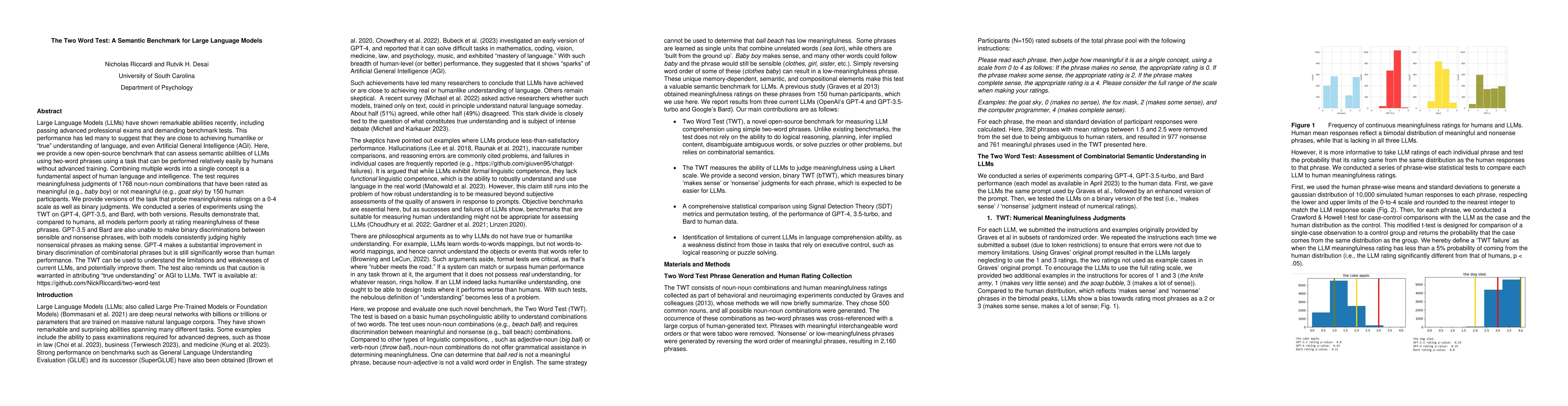 The Two Word Test (TWT) offers a new benchmark to evaluate the semantic abilities of large language models (LLMs) using meaningfulness judgments of 1,768 noun-noun pairs. Experiments show that while LLMs like GPT-4 perform better than others, they still lag behind human performance, highlighting the limitations of current LLMs and cautioning against claims of 'true understanding' or AGI.