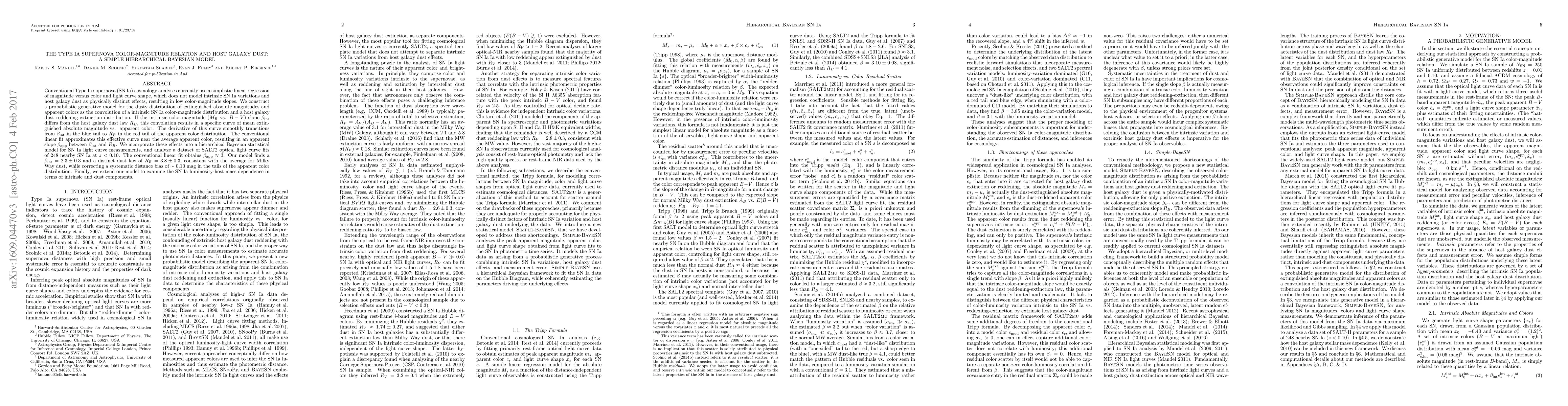 Conventional Type Ia supernova (SN Ia) cosmology analyses currently use a simplistic linear regression of magnitude versus color and light curve shape, which does not model intrinsic SN Ia variations and host galaxy dust as physically distinct effects, resulting in low color-magnitude slopes. We construct a probabilistic generative model for the dusty distribution of extinguished absolute magnitudes and apparent colors as the convolution of a intrinsic SN Ia color-magnitude distribution and a host galaxy dust reddening-extinction distribution. If the intrinsic color-magnitude ($M_B$ vs. $B-V$) slope $\beta_{int}$ differs from the host galaxy dust law $R_B$, this convolution results in a specific curve of mean extinguished absolute magnitude vs. apparent color. The derivative of this curve smoothly transitions from $\beta_{int}$ in the blue tail to $R_B$ in the red tail of the apparent color distribution. The conventional linear fit approximates this effective curve near the average apparent color, resulting in an apparent slope $\beta_{app}$ between $\beta_{int}$ and $R_B$. We incorporate these effects into a hierarchical Bayesian statistical model for SN Ia light curve measurements, and analyze a dataset of SALT2 optical light curve fits of 248 nearby SN Ia at z < 0.10. The conventional linear fit obtains $\beta_{app} \approx 3$. Our model finds a $\beta_{int} = 2.3 \pm 0.3$ and a distinct dust law of $R_B = 3.8 \pm 0.3$, consistent with the average for Milky Way dust, while correcting a systematic distance bias of $\sim 0.10$ mag in the tails of the apparent color distribution. Finally, we extend our model to examine the SN Ia luminosity-host mass dependence in terms of intrinsic and dust components.