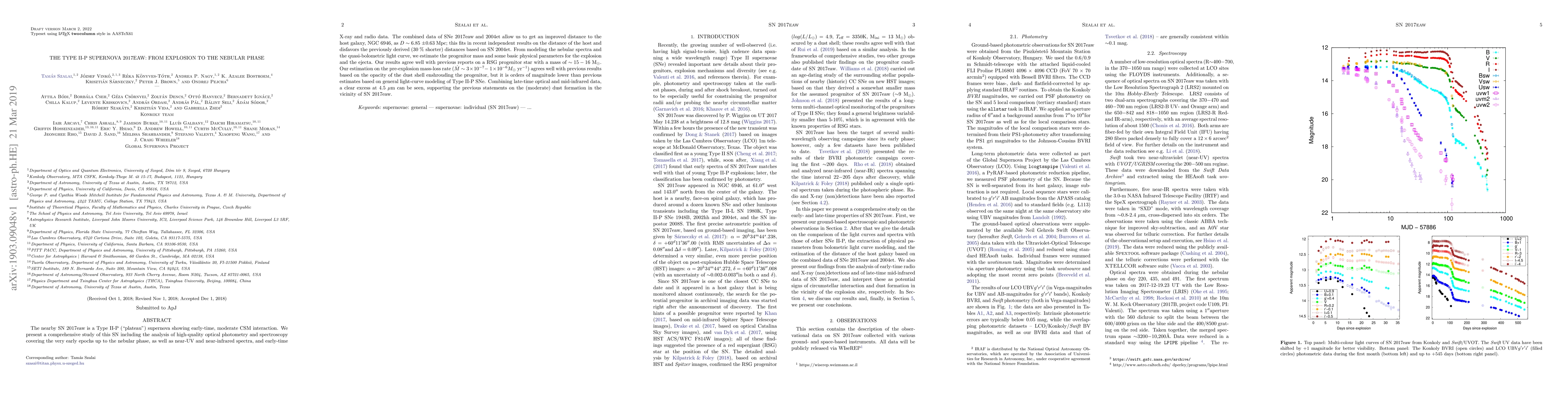 A team studied a Type II-P supernova 2017eaw, analyzing its explosion to nebular phase, and found a progenitor mass of around 15-16 solar masses, moderate dust formation, and improved distance to the host galaxy.
