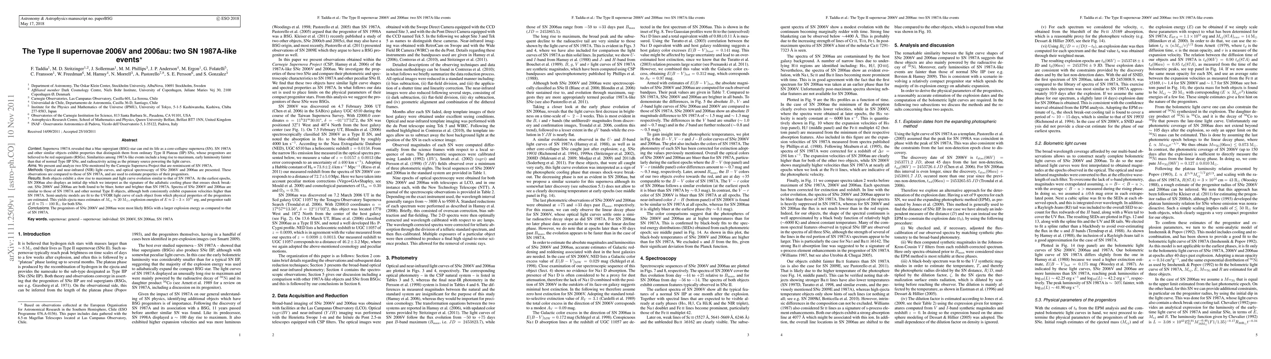 This paper analyzes two Type II supernovae, SNe 2006V and 2006au, which resemble SN 1987A in exhibiting a slow rise to maximum brightness and higher expansion velocities. The study estimates progenitor properties, suggesting both were likely blue supergiants with larger explosion energies than SN 1987A.