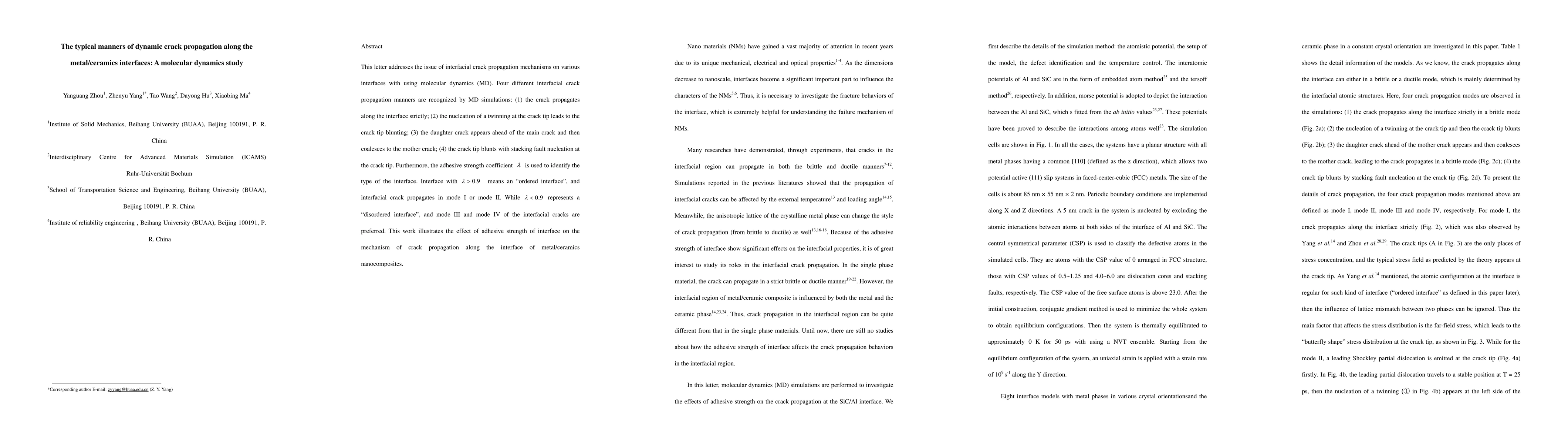 This study uses molecular dynamics simulations to identify four distinct manners of dynamic crack propagation along metal/ceramics interfaces, revealing the influence of adhesive strength coefficient on the propagation mechanism. Ordered interfaces with high adhesive strength favor mode I or II cracks, while disordered interfaces with lower strength exhibit mode III and IV propagation.