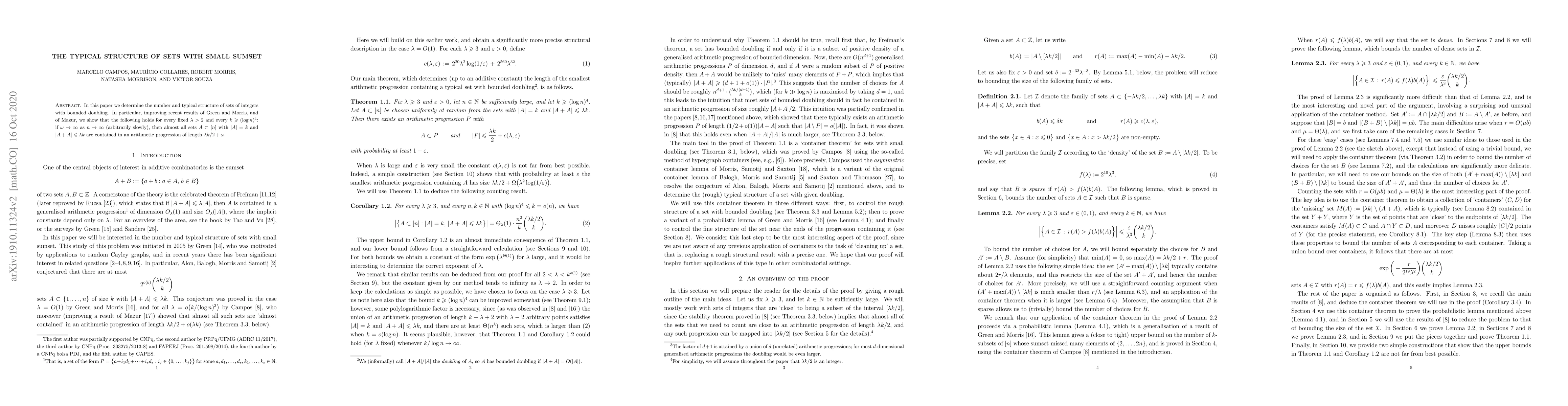 In this paper we determine the number and typical structure of sets of integers with bounded doubling. In particular, improving recent results of Green and Morris, and of Mazur, we show that the following holds for every fixed $\lambda > 2$ and every $k \geqslant (\log n)^4$: if $\omega \to \infty$ as $n \to \infty$ (arbitrarily slowly), then almost all sets $A \subset [n]$ with $|A| = k$ and $|A + A| \leqslant \lambda k$ are contained in an arithmetic progression of length $\lambda k/2 + \omega$.