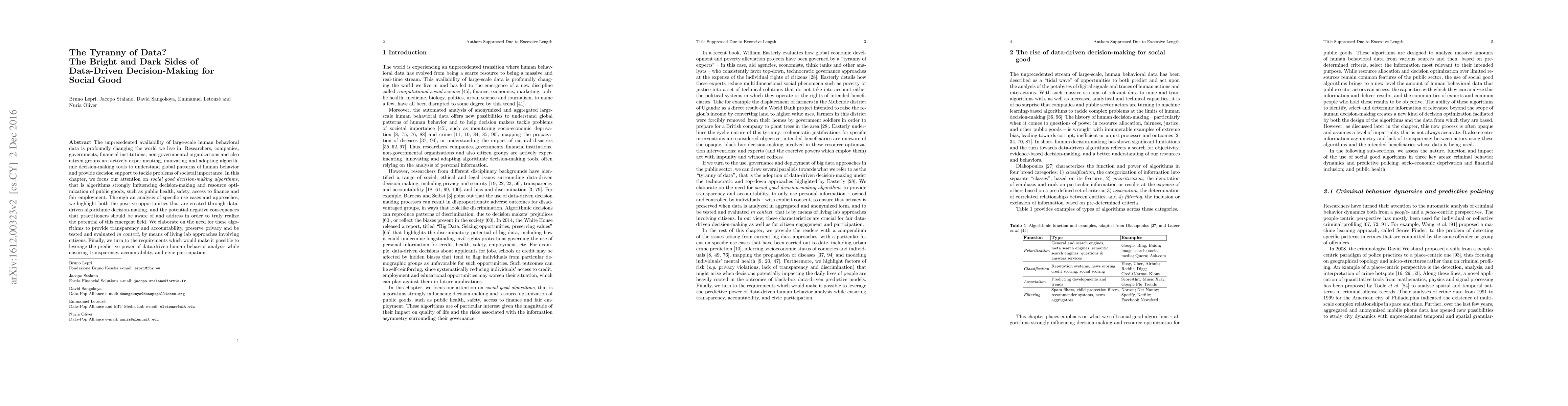 The unprecedented availability of large-scale human behavioral data is profoundly changing the world we live in. Researchers, companies, governments, financial institutions, non-governmental organizations and also citizen groups are actively experimenting, innovating and adapting algorithmic decision-making tools to understand global patterns of human behavior and provide decision support to tackle problems of societal importance. In this chapter, we focus our attention on social good decision-making algorithms, that is algorithms strongly influencing decision-making and resource optimization of public goods, such as public health, safety, access to finance and fair employment. Through an analysis of specific use cases and approaches, we highlight both the positive opportunities that are created through data-driven algorithmic decision-making, and the potential negative consequences that practitioners should be aware of and address in order to truly realize the potential of this emergent field. We elaborate on the need for these algorithms to provide transparency and accountability, preserve privacy and be tested and evaluated in context, by means of living lab approaches involving citizens. Finally, we turn to the requirements which would make it possible to leverage the predictive power of data-driven human behavior analysis while ensuring transparency, accountability, and civic participation.