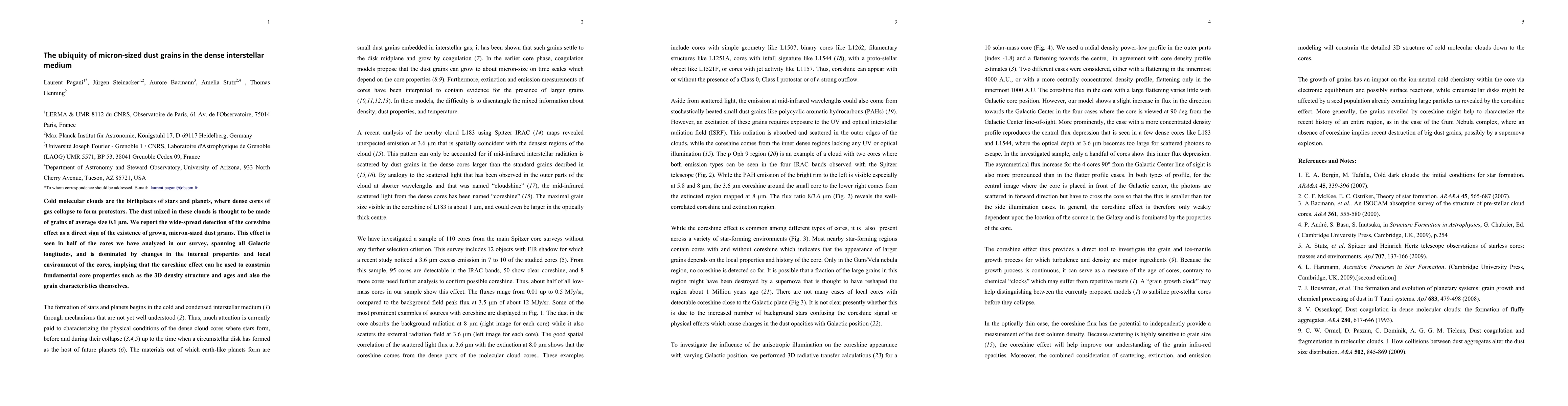 Cold molecular clouds are the birthplaces of stars and planets, where dense cores of gas collapse to form protostars. The dust mixed in these clouds is thought to be made of grains of an average size of 0.1 micrometer. We report the widespread detection of the coreshine effect as a direct sign of the existence of grown, micrometer-sized dust grains. This effect is seen in half of the cores we have analyzed in our survey, spanning all Galactic longitudes, and is dominated by changes in the internal properties and local environment of the cores, implying that the coreshine effect can be used to constrain fundamental core properties such as the three-dimensional density structure and ages and also the grain characteristics themselves.