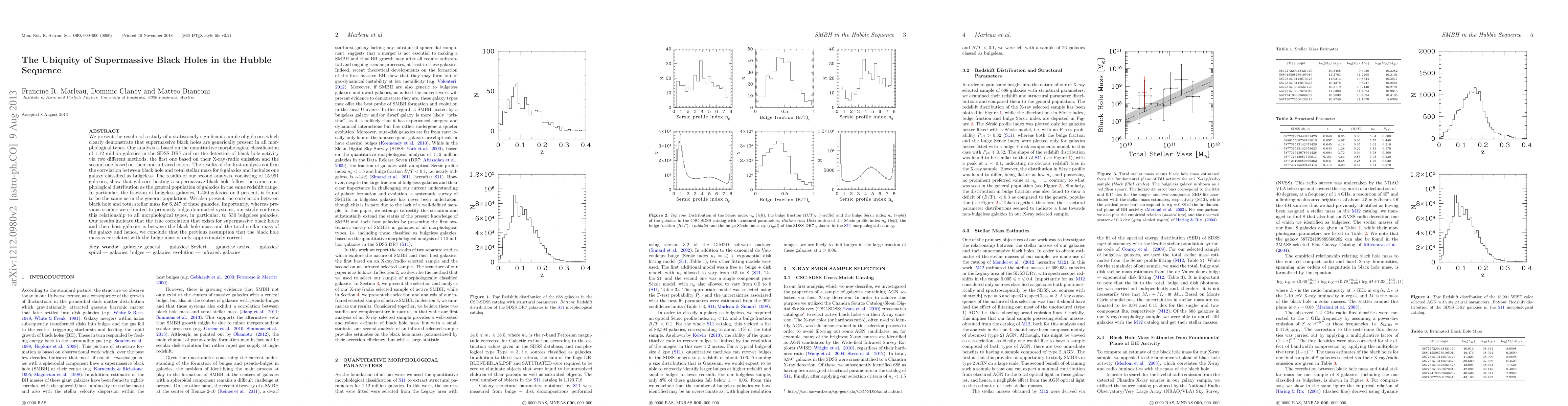 We present the results of a study of a statistically significant sample of galaxies which clearly demonstrate that supermassive black holes are generically present in all morphological types. Our analysis is based on the quantitative morphological classification of 1.12 million galaxies in the SDSS DR7 and on the detection of black hole activity via two different methods, the first one based on their X-ray/radio emission and the second one based on their mid-infrared colors. The results of the first analysis confirm the correlation between black hole and total stellar mass for 8 galaxies and includes one galaxy classified as bulgeless. The results of our second analysis, consisting of 15,991 galaxies, show that galaxies hosting a supermassive black hole follow the same morphological distribution as the general population of galaxies in the same redshift range. In particular, the fraction of bulgeless galaxies, 1,450 galaxies or 9 percent, is found to be the same as in the general population. We also present the correlation between black hole and total stellar mass for 6,247 of these galaxies. Importantly, whereas previous studies were limited to primarily bulge-dominated systems, our study confirms this relationship to all morphological types, in particular, to 530 bulgeless galaxies. Our results indicate that the true correlation that exists for supermassive black holes and their host galaxies is between the black hole mass and the total stellar mass of the galaxy and hence, we conclude that the previous assumption that the black hole mass is correlated with the bulge mass is only approximately correct.