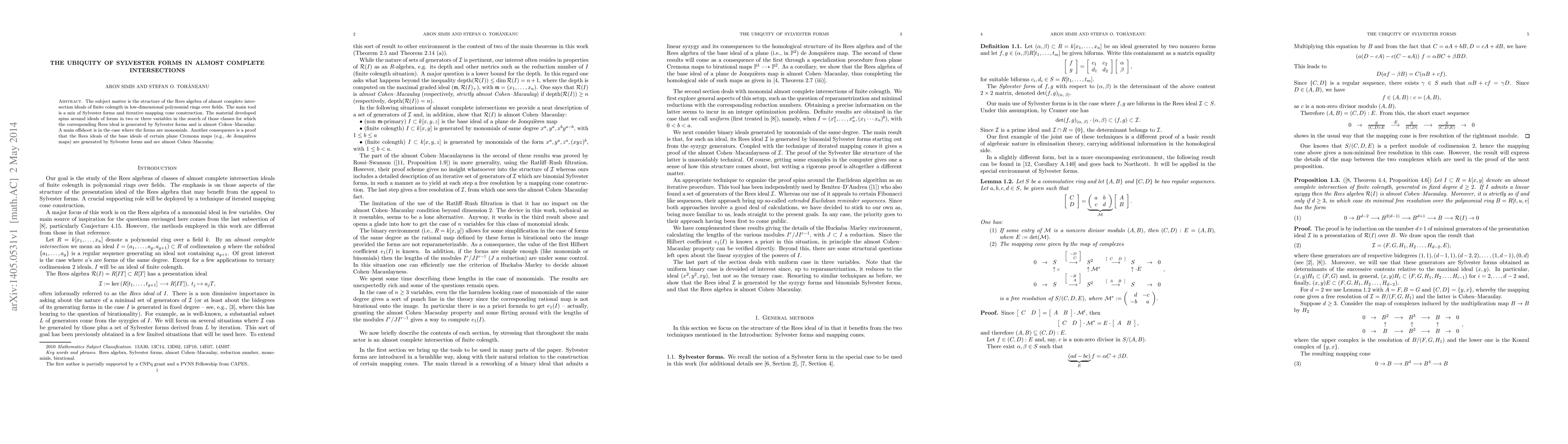 The subject matter is the structure of the Rees algebra of almost complete intersection ideals of finite colength in low-dimensional polynomial rings over fields. The main tool is a mix of Sylvester forms and iterative mapping cone construction. The material developed spins around ideals of forms in two or three variables in the search of those classes for which the corresponding Rees ideal is generated by Sylvester forms and is almost Cohen--Macaulay. A main offshoot is in the case where the forms are monomials. Another consequence is a proof that the Rees ideals of the base ideals of certain plane Cremona maps (e.g., de Jonqui\`eres maps) are generated by Sylvester forms and are almost Cohen--Macaulay.