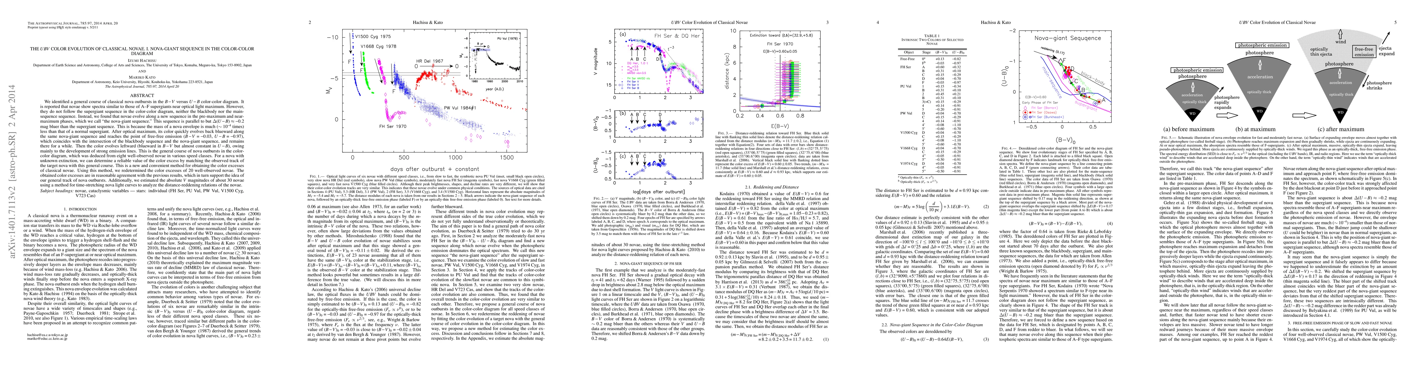 This paper identifies a distinct "nova-giant sequence" in the B-V versus U-B color-color diagram for classical novae, which diverges from both supergiant and main-sequence sequences due to the nova envelope's smaller mass. This method allows for the determination of color excesses for novae, providing a reliable track for their evolution.