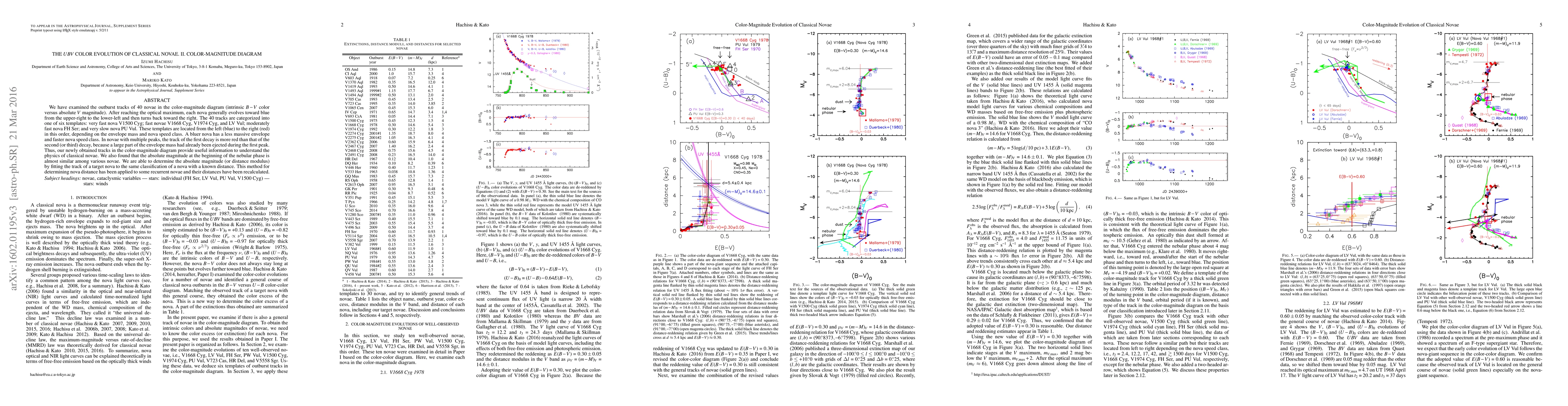 This study categorizes the color-magnitude evolution of 40 classical novae into six templates based on their outburst tracks, revealing that bluer novae typically have less massive envelopes and faster speeds. The method of determining nova distances by fitting the track of a target nova to a known-distance template is also introduced.