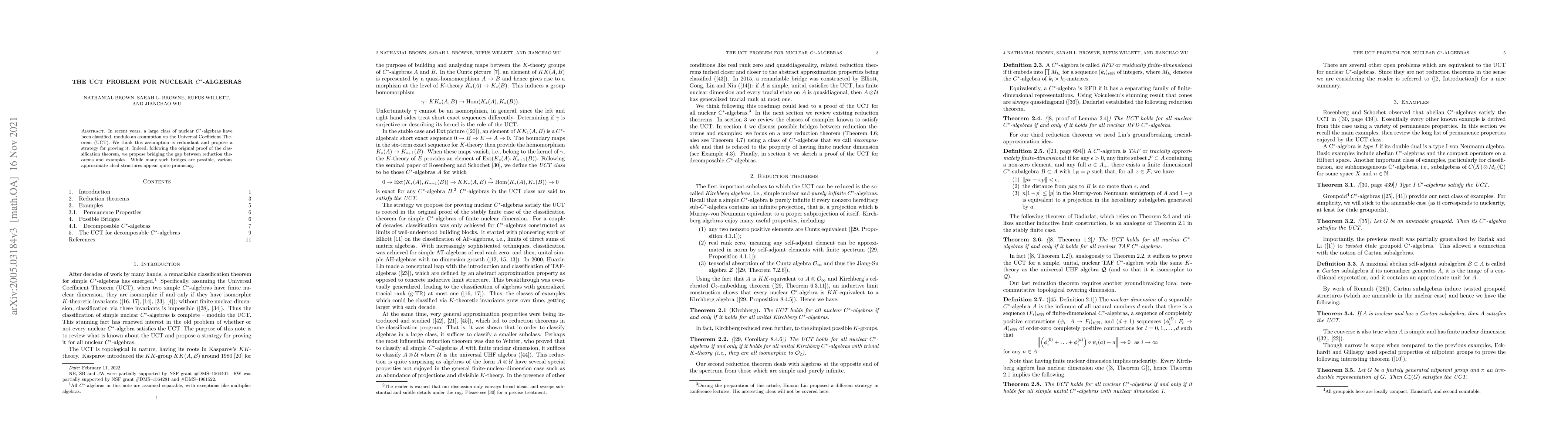 In recent years, a large class of nuclear $C^\ast$-algebras have been classified, modulo an assumption on the Universal Coefficient Theorem (UCT). We think this assumption is redundant and propose a strategy for proving it. Indeed, following the original proof of the classification theorem, we propose bridging the gap between reduction theorems and examples. While many such bridges are possible, various approximate ideal structures appear quite promising.