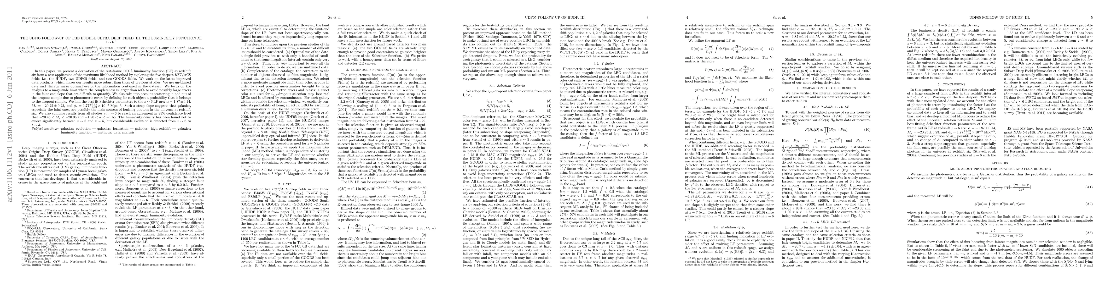 Schechter parameters to the z~6 LF are: alpha = 1.87 +/- 0.14, M* = -20.25 +/-