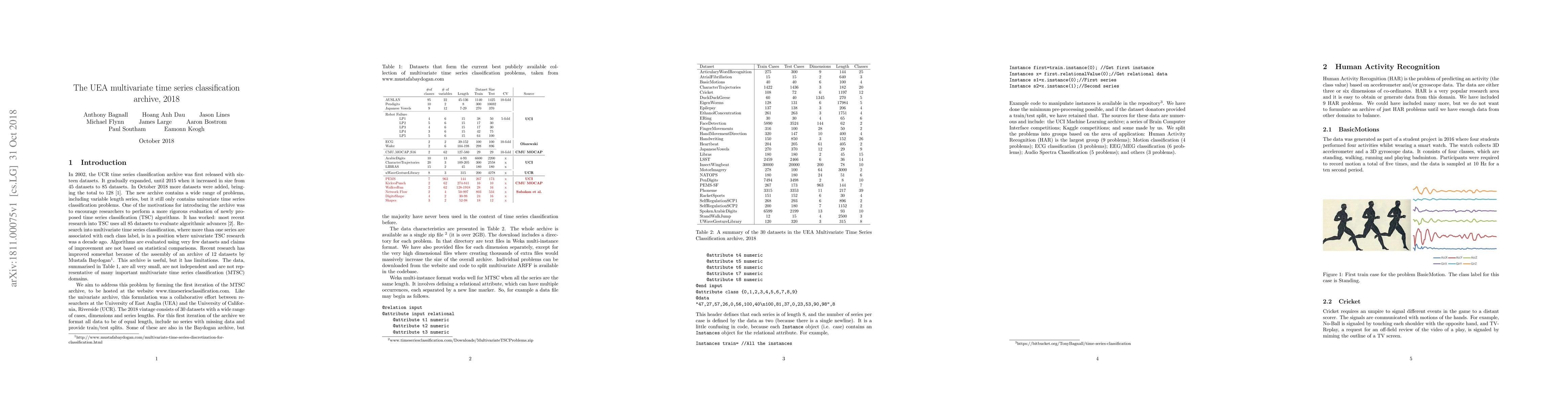 The UEA multivariate time series classification archive, launched in 2018, aims to encourage rigorous evaluation of multivariate time series classification algorithms by providing a collaborative collection of 30 datasets, addressing the lack of comprehensive benchmarks in this field. The archive aims to foster advancements similar to those seen in univariate time series classification research.