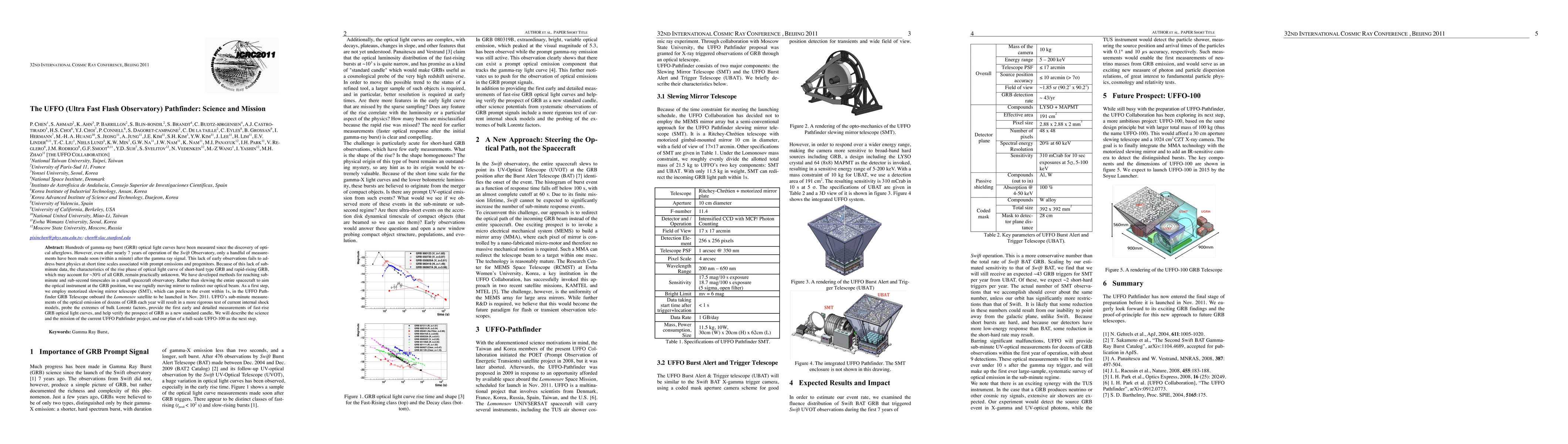 The UFFO Pathfinder employs a slewing mirror telescope (SMT) and the UFFO Burst Alert and Trigger Telescope (UBAT) to redirect the optical path of GRB beams instead of slewing the entire spacecraft. The SMT is a Ritchey-Chrétien telescope with a motorized gimbal-mounted 10 cm diameter mirror, while UBAT uses a coded mask aperture camera scheme for transient detection with a wide field of view.
