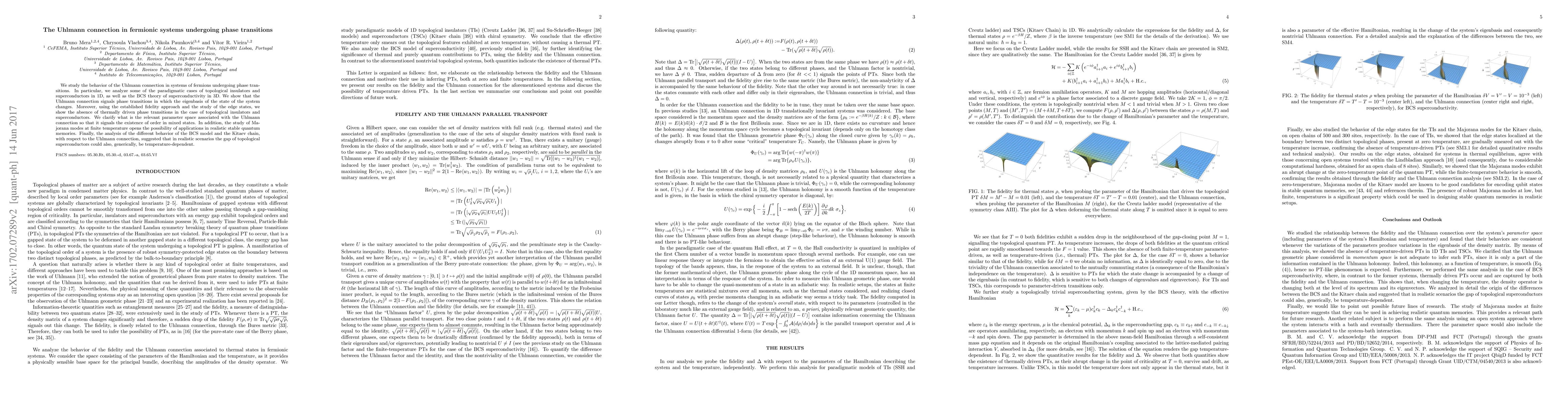 We study the behaviour of the Uhlmann connection in systems of fermions undergoing phase transitions. In particular, we analyse some of the paradigmatic cases of topological insulators and superconductors in dimension one, as well as the BCS theory of superconductivity in three dimensions. We show that the Uhlmann connection signals phase transitions in which the eigenbasis of the state of the system changes. Moreover, using the established fidelity approach and the study of the edge states, we show the absence of thermally driven phase transitions in the case of topological insulators and superconductors. We clarify what is the relevant parameter space associated with the Uhlmann connection so that it signals the existence of order in mixed states.