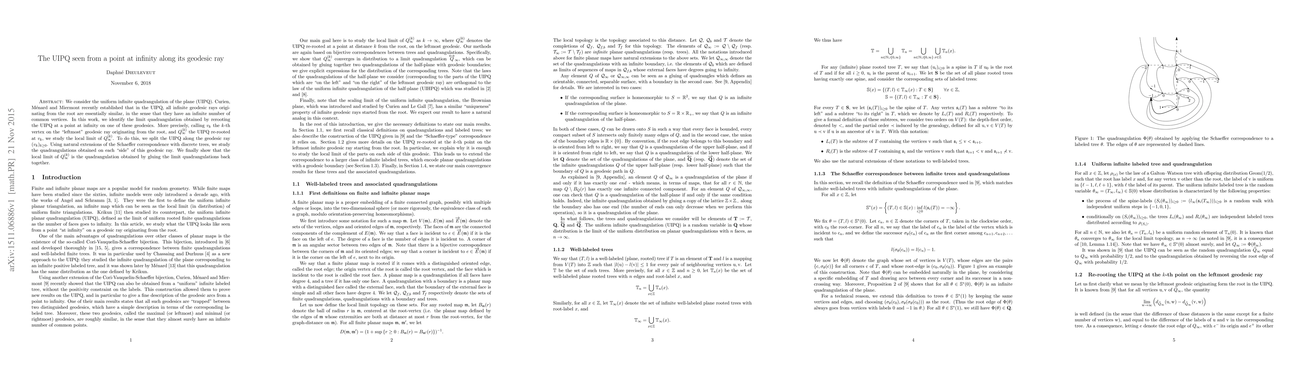This research paper studies the uniform infinite quadrangulation of the plane (UIPQ) and its local limit when rerooted at a point at infinity on one of its geodesic rays, revealing that it converges to a specific quadrangulation.