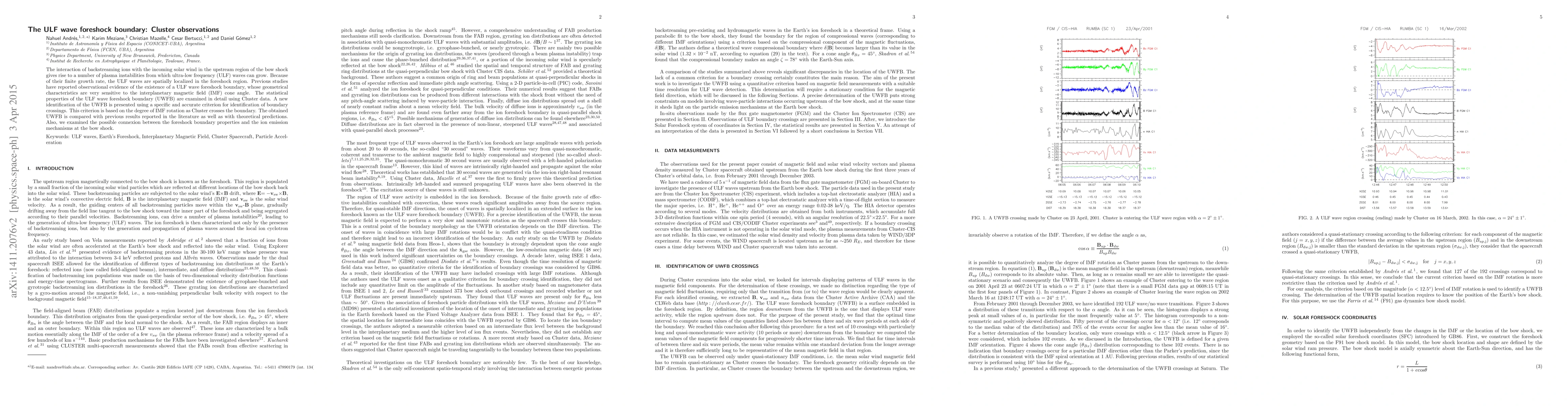 This paper investigates the ULF wave foreshock boundary using Cluster data, identifying it through precise IMF rotation criteria. It compares the boundary's geometrical characteristics with previous studies and theoretical predictions, exploring links between boundary properties and ion emission mechanisms at the bow shock.