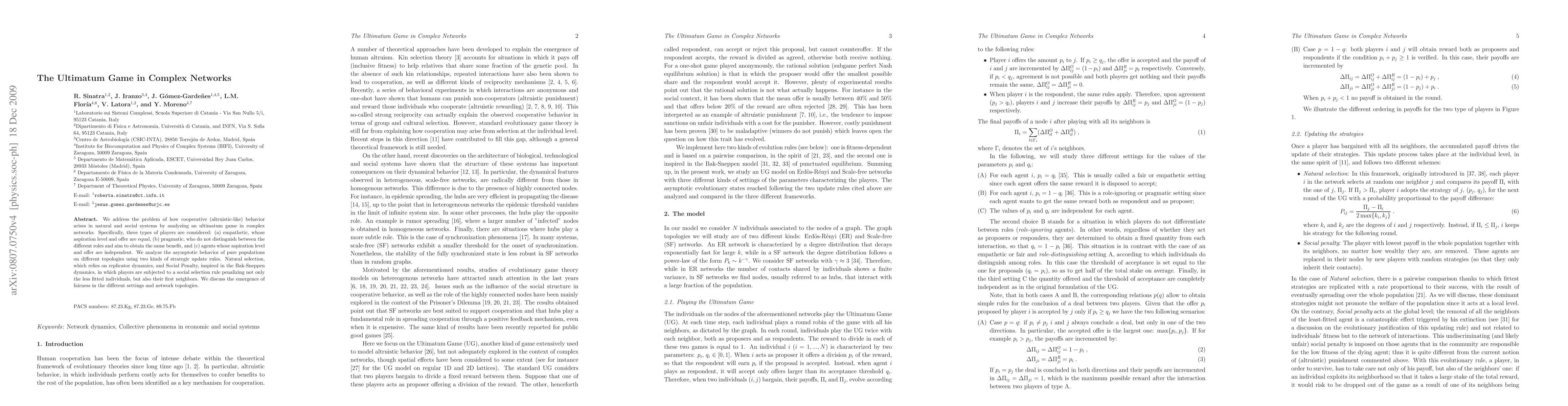 This paper investigates cooperative behavior in ultimatum games across various network topologies, focusing on three player types: empathetic, pragmatic, and independent agents. It examines the emergence of fairness using natural selection and social penalty update rules, revealing how network structure influences altruistic behavior.