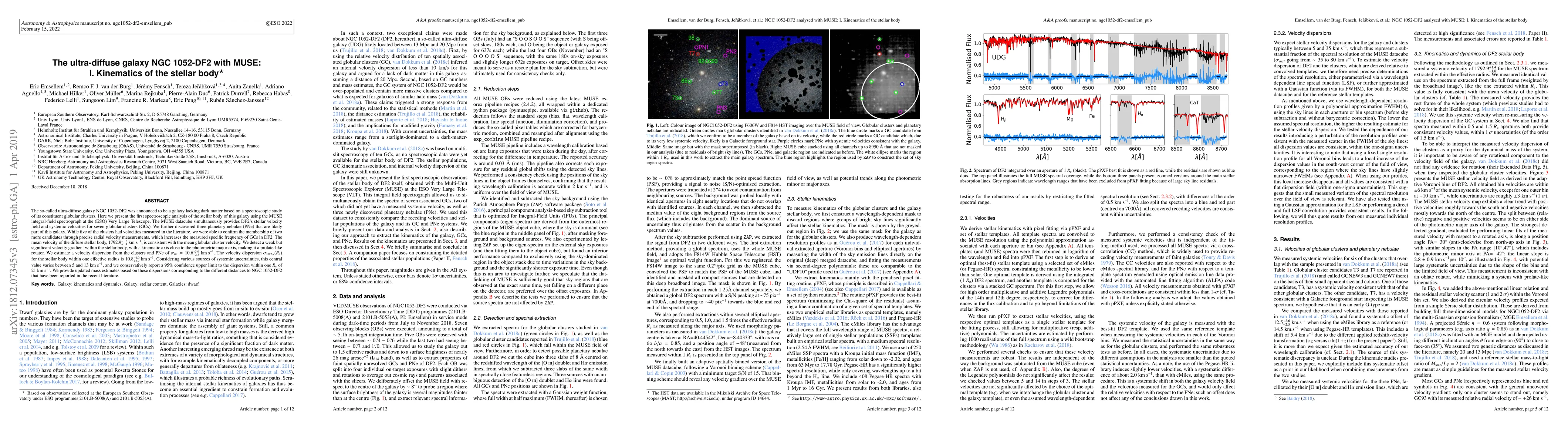 This study presents a kinematic analysis of the stellar body of the ultra-diffuse galaxy NGC 1052-DF2 using integral-field spectroscopy from MUSE at the VLT. The research simultaneously provides the galaxy's stellar velocity field and systemic velocities for seven globular clusters (GCs) and discovers three planetary nebulae (PNe) within the galaxy.