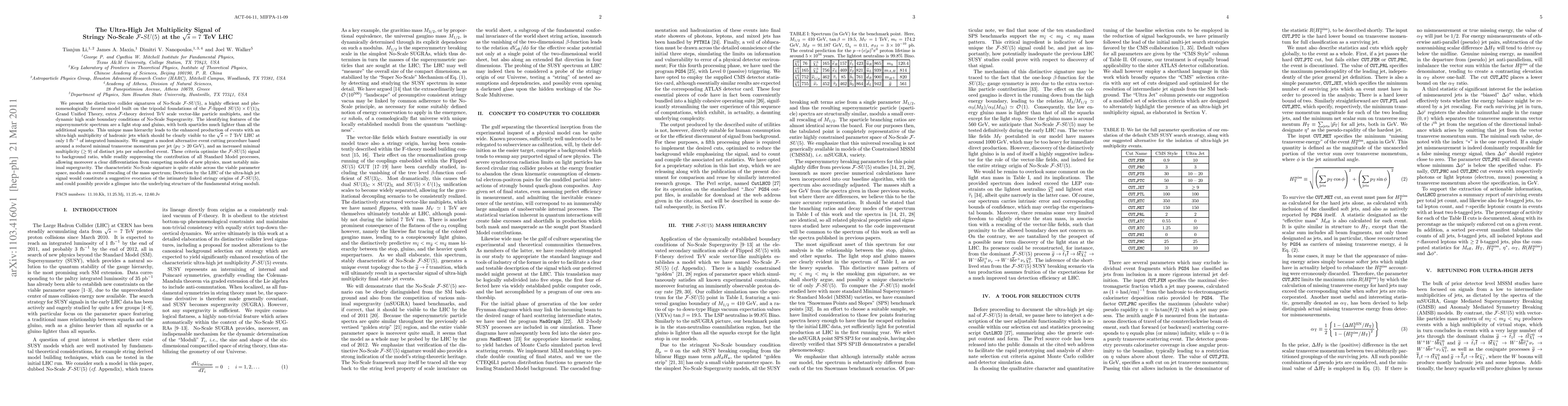 We present the distinctive collider signatures of No-Scale F-SU(5), a highly efficient and phenomenologically favored model built on the tripodal foundations of the F-lipped SU(5) X U(1)_X Grand Unified Theory, extra F-theory derived TeV scale vector-like particle multiplets, and the dynamic high scale boundary conditions of No-Scale Supergravity. The identifying features of the supersymmetric spectrum are a light stop and gluino, with both sparticles much lighter than all the additional squarks. This unique mass hierarchy leads to the enhanced production of events with an ultra-high multiplicity of hadronic jets which should be clearly visible to the \sqrt{s} = 7 TeV LHC at only 1 inverse fb of integrated luminosity. We suggest a modest alternative event cutting procedure based around a reduced minimal transverse momentum per jet (p_T > 20 GeV), and an increased minimal multiplicity (>= 9) of distinct jets per subscribed event. These criteria optimize the F-SU(5) signal to background ratio, while readily suppressing the contribution of all Standard Model processes, allowing moreover a clear differentiation from competing models of new physics, most notably minimal supergravity. The characteristic No-Scale signature is quite stable across the viable parameter space, modulo an overall rescaling of the mass spectrum; Detection by the LHC of the ultra-high jet signal would constitute a suggestive evocation of the intimately linked stringy origins of F-SU(5), and could possibly provide a glimpse into the underlying structure of the fundamental string moduli.