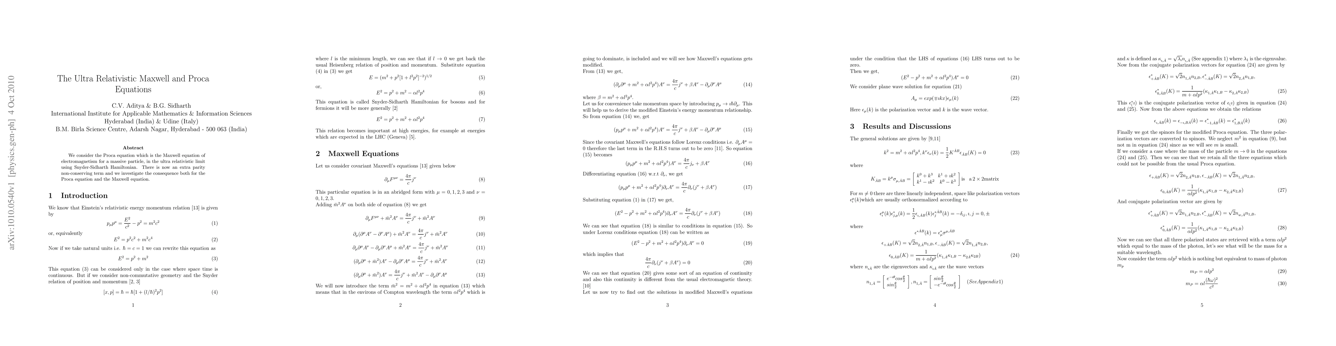Summary: The paper explores the ultra-relativistic Proca equation, which extends the Maxwell equation for a massive particle, incorporating a parity non-conserving term via the Snyder-Sidharth Hamiltonian, and examines its implications for both the Proca and Maxwell equations.