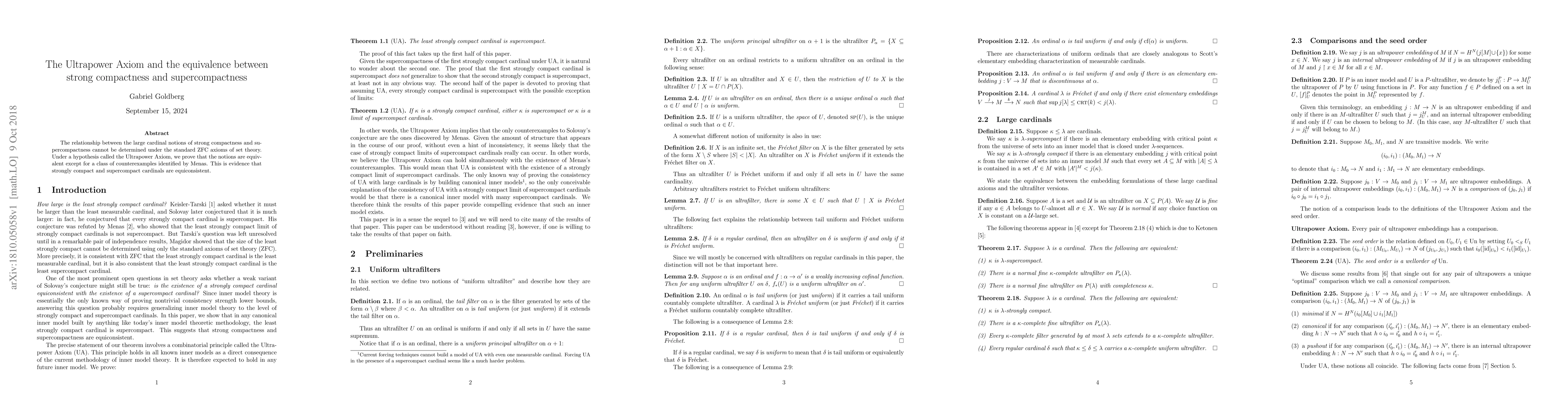 Summary: The Ultrapower Axiom establishes the equivalence between strong compactness and supercompactness of cardinals, except for a specific class of counterexamples, suggesting these notions are equiconsistent. This relationship cannot be determined under standard ZFC set theory.
