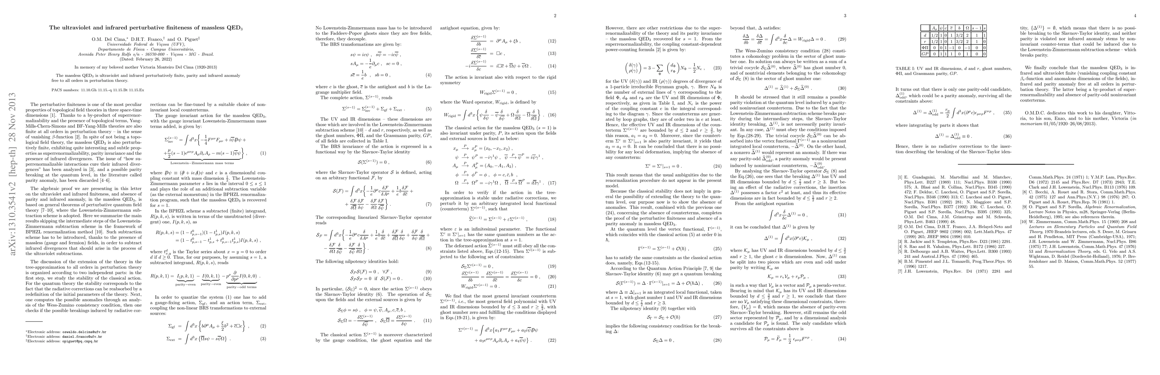 The massless QED$_3$ is ultraviolet and infrared perturbatively finite, parity and infrared anomaly free to all orders in perturbation theory.
