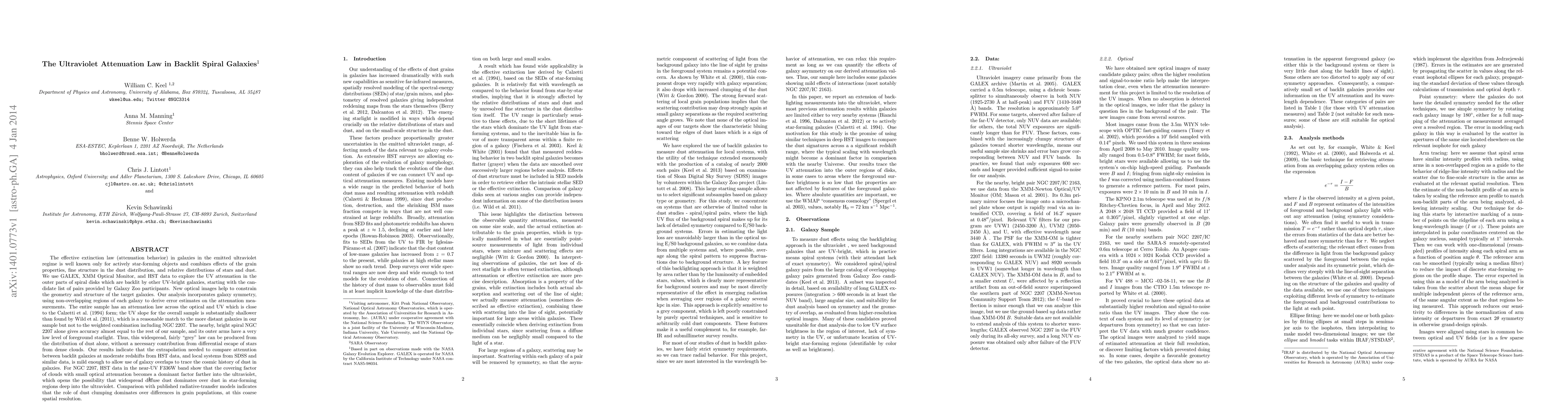 This study investigates the ultraviolet attenuation law in backlit spiral galaxies using GALEX, XMM, and HST data, finding that the attenuation law is close to the Calzetti form. NGC 2207 shows a "grey" law dominated by dust distribution, suggesting widespread diffuse dust may play a significant role in UV attenuation.