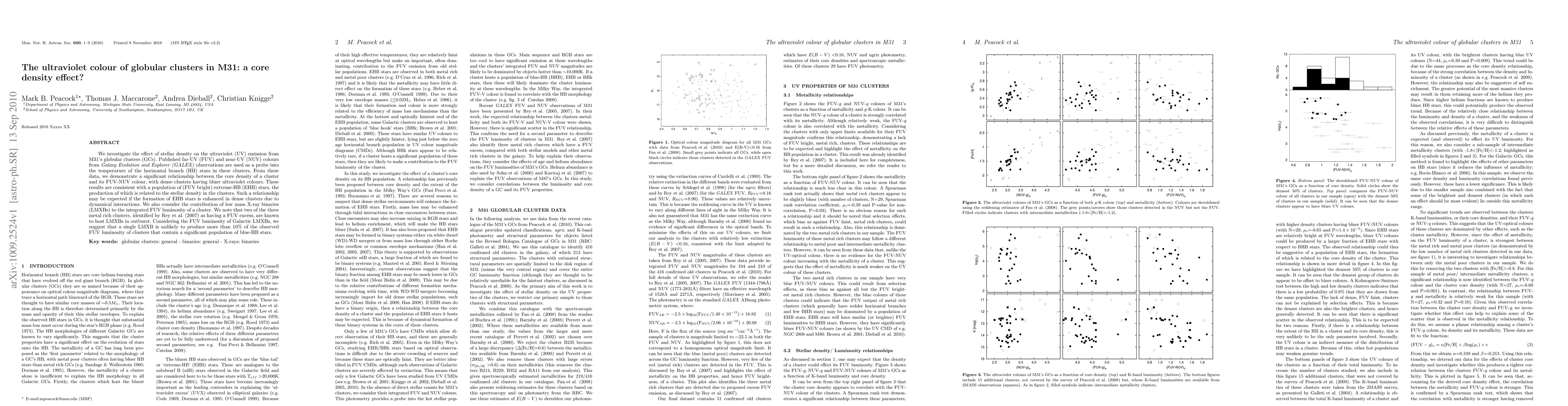 We investigate the effect of stellar density on the ultraviolet (UV) emission from M31's globular clusters (GCs). Published far-UV (FUV) and near-UV (NUV) colours from Galaxy Evolution and Explorer (GALEX) observations are used as a probe into the temperature of the horizontal branch (HB) stars in these clusters. From these data, we demonstrate a significant relationship between the core density of a cluster and its FUV-NUV colour, with dense clusters having bluer ultraviolet colours. These results are consistent with a population of (FUV bright) extreme-HB (EHB) stars, the production of which is related to the stellar density in the clusters. Such a relationship may be expected if the formation of EHB stars is enhanced in dense clusters due to dynamical interactions. We also consider the contribution of low mass X-ray binaries (LMXBs) to the integrated FUV luminosity of a cluster. We note that two of the three metal rich clusters, identified by Rey et al. 2007 as having a FUV excess, are known to host LMXBs in outburst. Considering the FUV luminosity of Galactic LMXBs, we suggest that a single LMXB is unlikely to produce more than 10% of the observed FUV luminosity of clusters that contain a significant population of blue-HB stars.