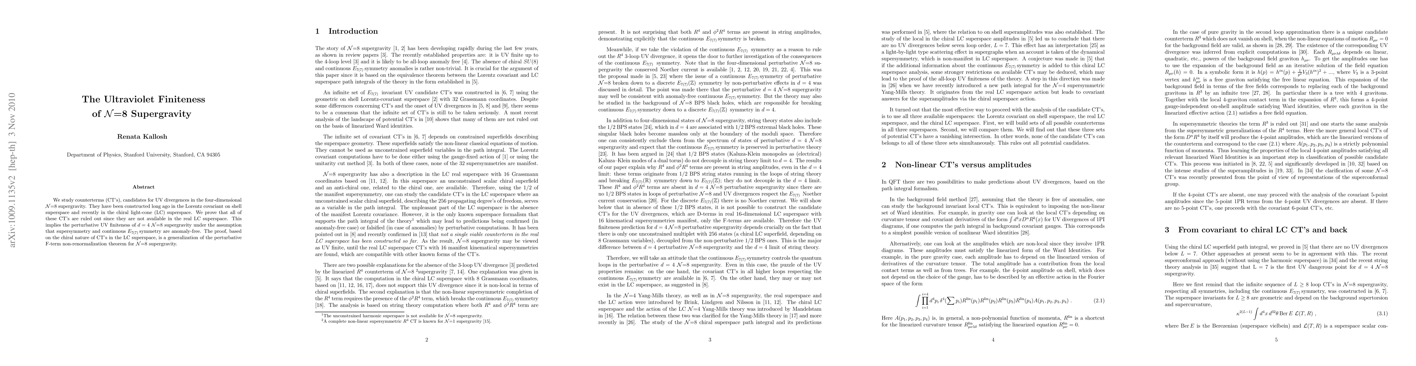 The paper demonstrates that four-dimensional N=8 supergravity is perturbatively ultraviolet finite by proving the non-availability of certain counterterms in chiral light-cone superspace, supporting the assumption of anomaly-free supersymmetry and E7 symmetry. This conclusion extends the perturbative F-term non-renormalization theorem.