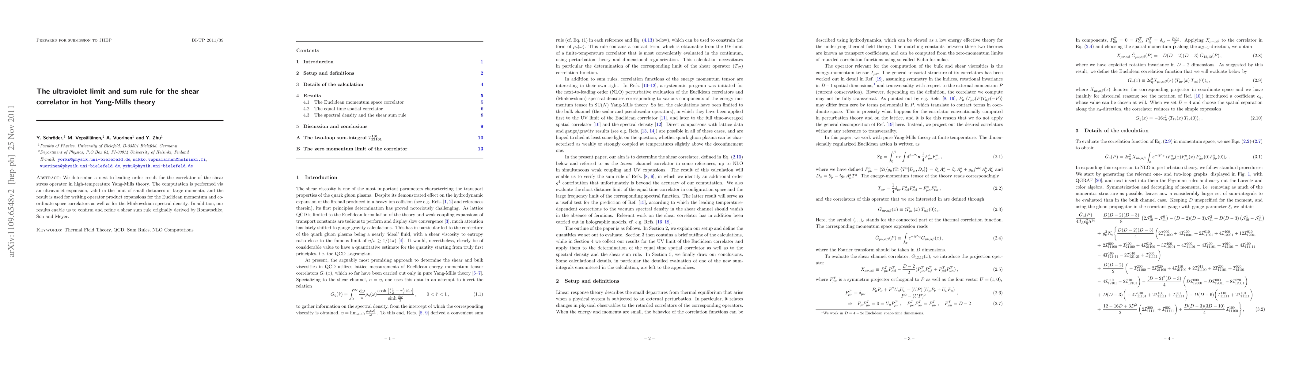 This paper presents a next-to-leading order calculation for the shear stress correlator in high-temperature Yang-Mills theory using an ultraviolet expansion. The findings refine a shear sum rule and provide operator product expansions for correlators in both Euclidean and Minkowski spaces.