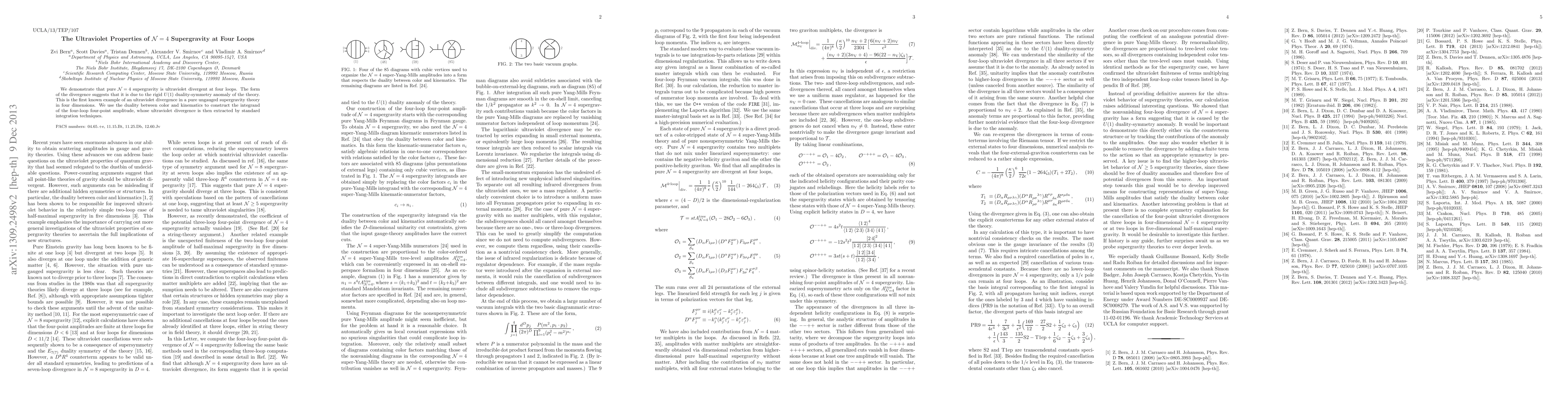 This research reveals ultraviolet divergence in pure N=4 supergravity at four loops, attributed to the U(1) duality-symmetry anomaly. This marks the first instance of such a divergence in ungauged supergravity theories in four dimensions, identified through the color-kinematics duality approach.