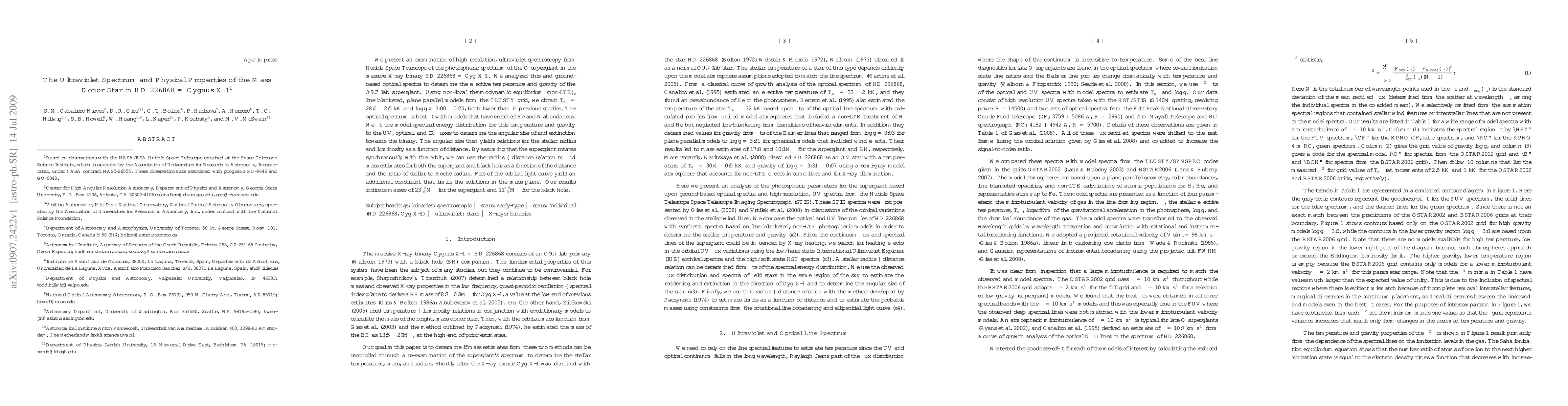 We present an examination of high resolution, ultraviolet spectroscopy from Hubble Space Telescope of the photospheric spectrum of the O-supergiant in the massive X-ray binary HD 226868 = Cyg X-1. We analyzed this and ground-based optical spectra to determine the effective temperature and gravity of the O9.7 Iab supergiant. Using non-local thermodynamic equilibrium (non-LTE), line blanketed, plane parallel models from the TLUSTY grid, we obtain T_eff = 28.0 +/- 2.5kK and log g > 3.00 +/- 0.25, both lower than in previous studies. The optical spectrum is best fit with models that have enriched He and N abundances. We fit the model spectral energy distribution for this temperature and gravity to the UV, optical, and IR fluxes to determine the angular size of and extinction towards the binary. The angular size then yields relations for the stellar radius and luminosity as a function of distance. By assuming that the supergiant rotates synchronously with the orbit, we can use the radius - distance relation to find mass estimates for both the supergiant and black hole as a function of the distance and the ratio of stellar to Roche radius. Fits of the orbital light curve yield an additional constraint that limits the solutions in the mass plane. Our results indicate masses of 23^{+8}_{-6} M_sun for the supergiant and 11^{+5}_{-3} M_sun for the black hole.