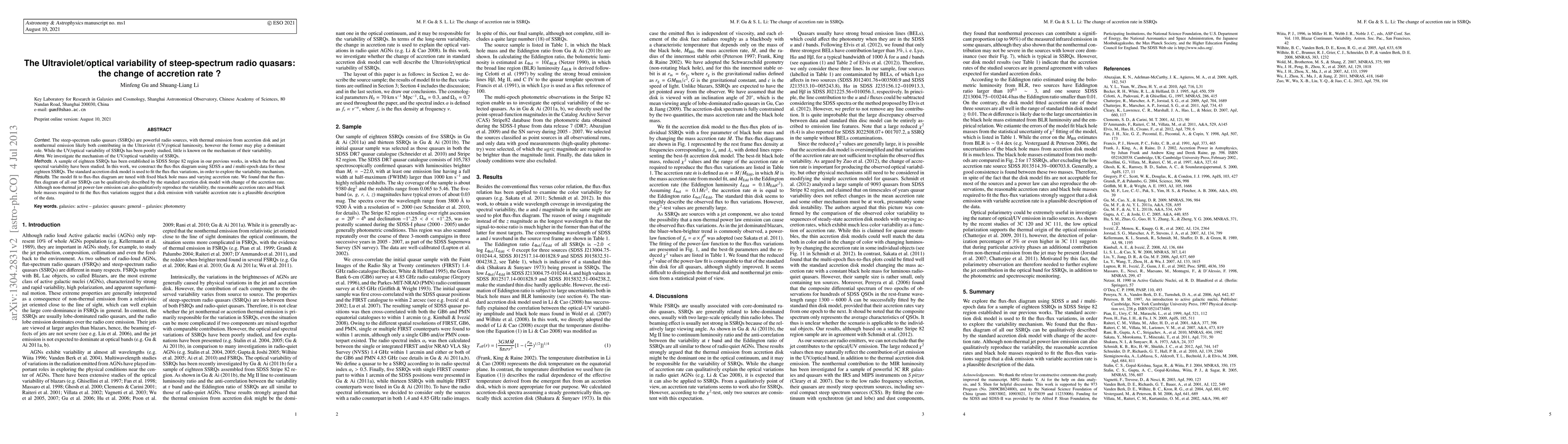 This study investigates the ultraviolet/optical variability of steep-spectrum radio quasars, finding that changes in accretion rate can explain the observed flux-flux variations.