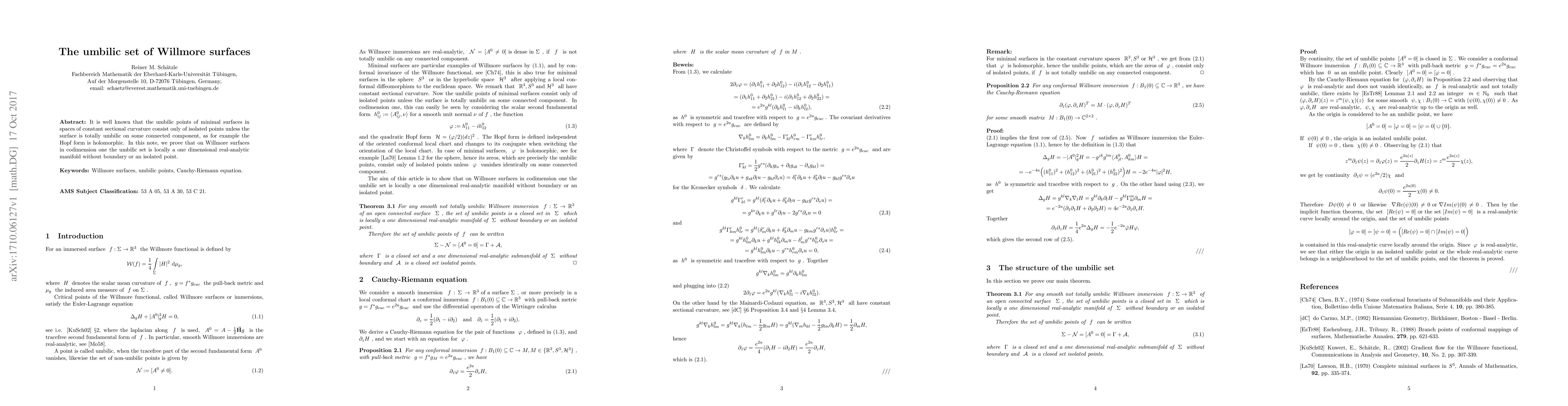 This paper proves that on Willmore surfaces in codimension one, the umbilic set is either a one-dimensional real-analytic manifold without boundary or an isolated point, contrasting with minimal surfaces where umbilic points are typically isolated unless the surface is totally umbilic.