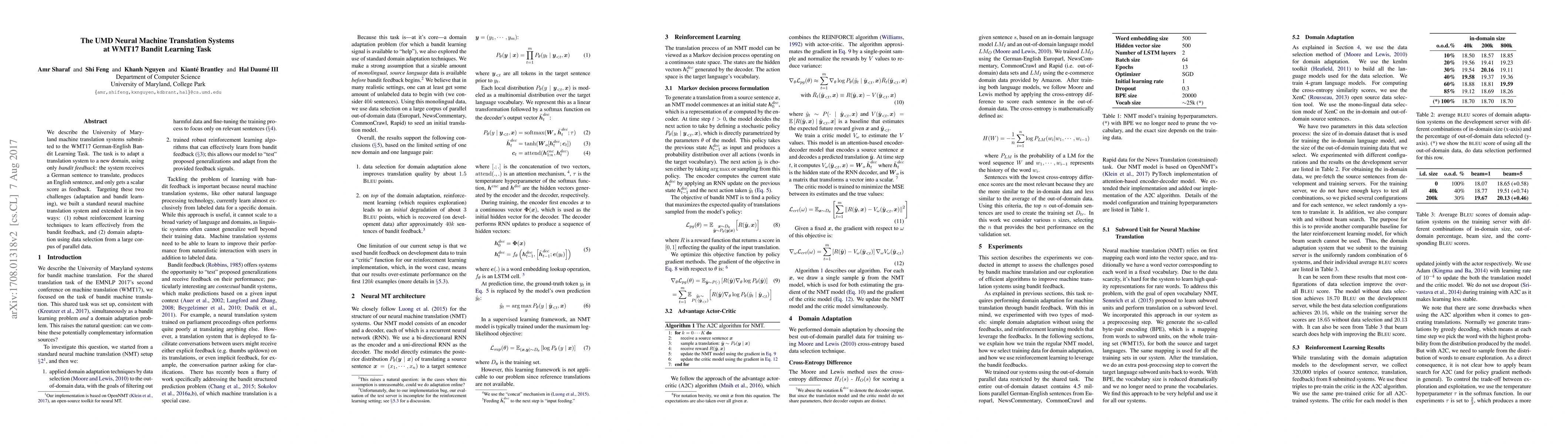 We describe the University of Maryland machine translation systems submitted to the WMT17 German-English Bandit Learning Task. The task is to adapt a translation system to a new domain, using only bandit feedback: the system receives a German sentence to translate, produces an English sentence, and only gets a scalar score as feedback. Targeting these two challenges (adaptation and bandit learning), we built a standard neural machine translation system and extended it in two ways: (1) robust reinforcement learning techniques to learn effectively from the bandit feedback, and (2) domain adaptation using data selection from a large corpus of parallel data.