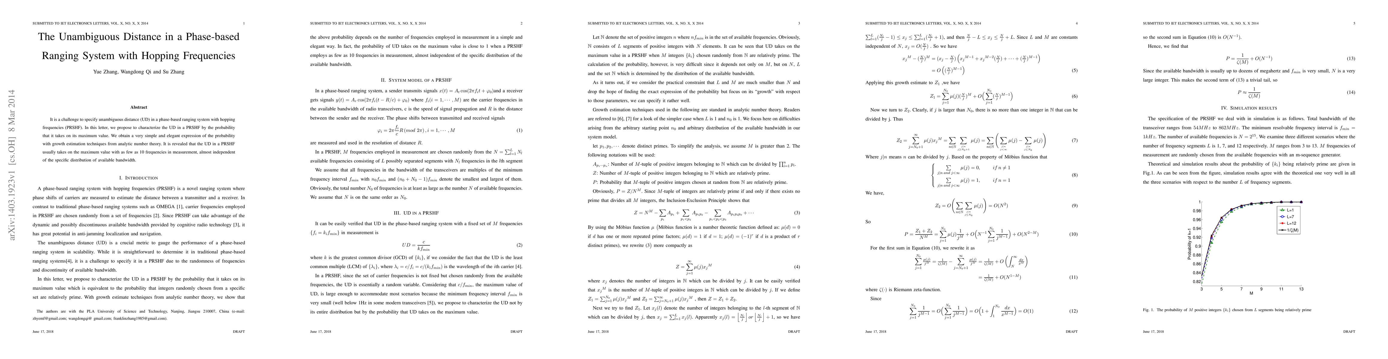 A new method calculates the unambiguous distance in a phase-based ranging system using hopping frequencies with just 10 measurements, regardless of available bandwidth distribution.