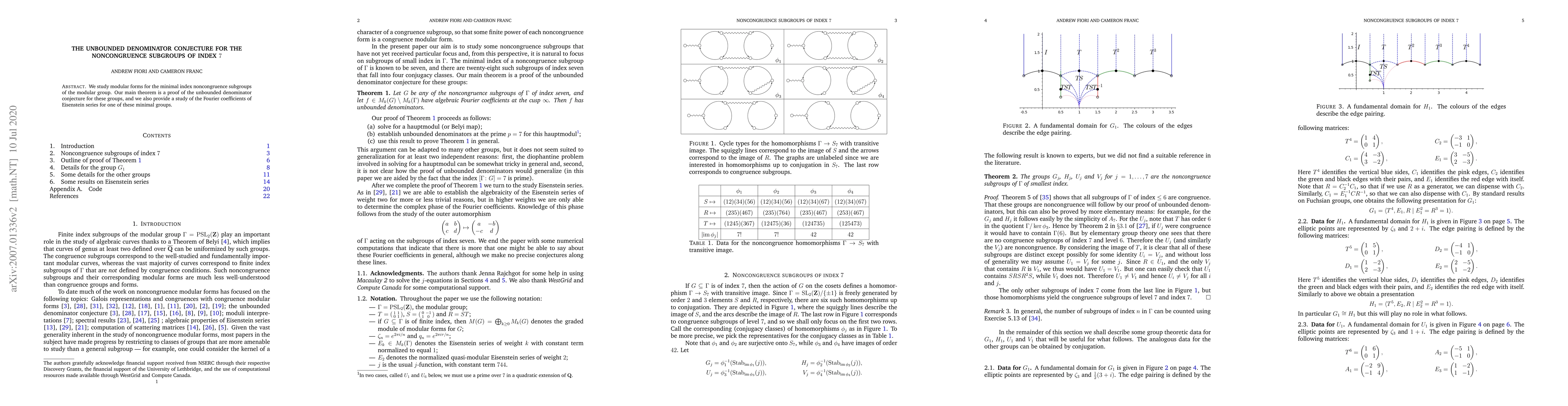 This paper proves the unbounded denominator conjecture for modular forms on noncongruence subgroups of index 7, making significant contributions to number theory.