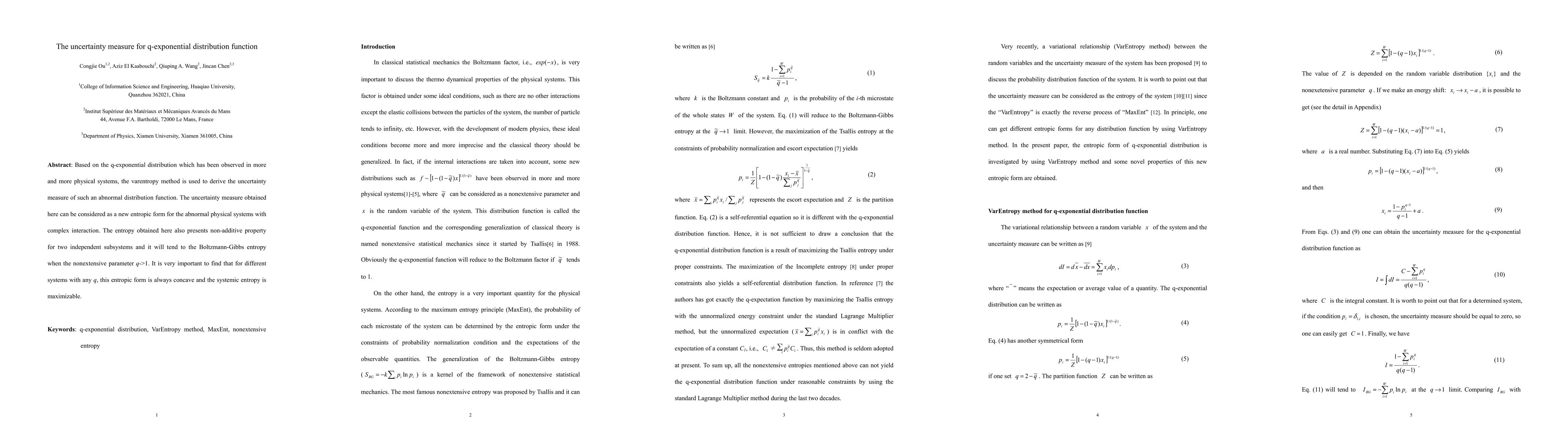 Based on the q-exponential distribution which has been observed in more and more physical systems, the varentropy method is used to derive the uncertainty measure of such an abnormal distribution function. The uncertainty measure obtained here can be considered as a new entropic form for the abnormal physical systems with complex interaction. The entropy obtained here also presents non-additive property for two independent subsystems and it will tend to the Boltzmann-Gibbs entropy when the nonextensive parameter q->1. It is very important to find that for different systems with any q, this entropic form is always concave and the systemic entropy is maximizable.
