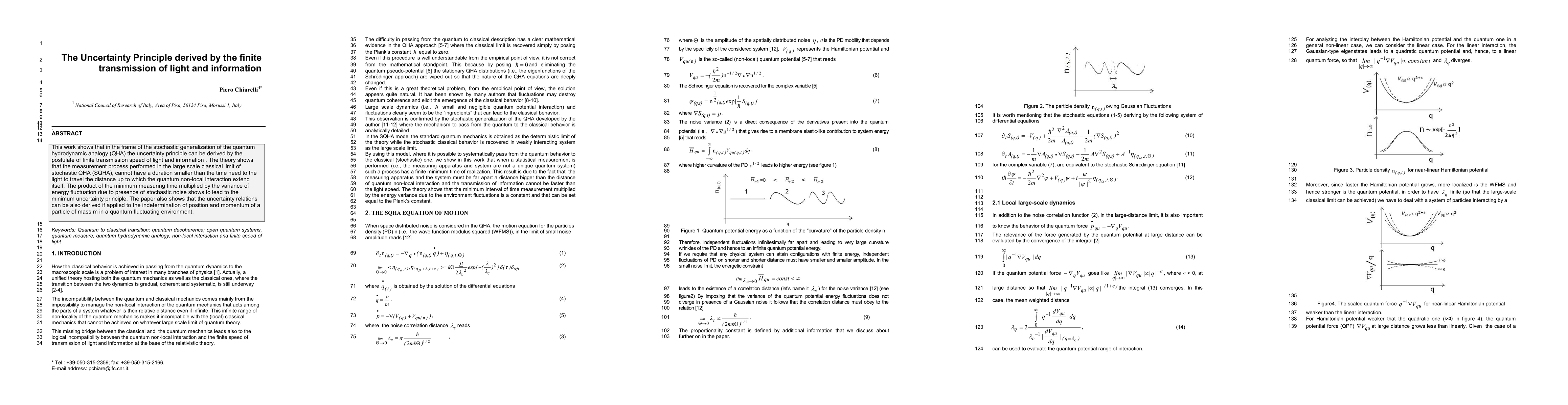 This work shows that in the frame of the stochastic generalization of the quantum hydrodynamic analogy (QHA) the uncertainty principle can be derived by the postulate of finite transmission speed of light and information . The theory shows that the measurement process performed in the large scale classical limit of stochastic QHA (SQHA), cannot have a duration smaller than the time need to the light to travel the distance up to which the quantum non-local interaction extend itself. The product of the minimum measuring time multiplied by the variance of energy fluctuation due to presence of stochastic noise shows to lead to the minimum uncertainty principle. The paper also shows that the uncertainty relations can be also derived if applied to the indetermination of position and momentum of a particle of mass m in a quantum fluctuating environment.