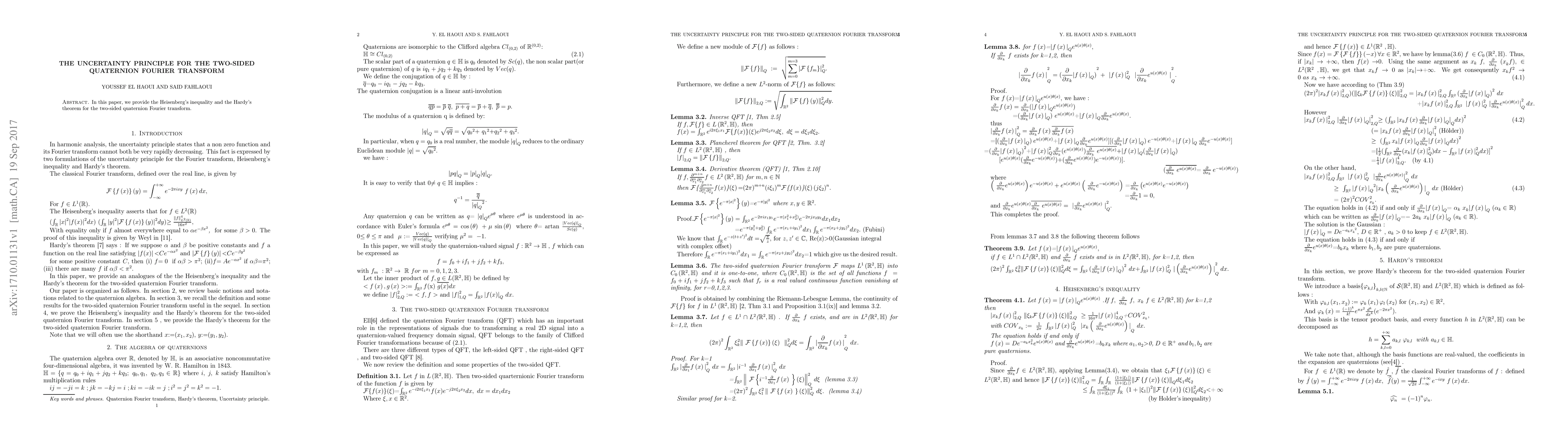 Summary: This paper establishes Heisenberg's uncertainty principle and Hardy's theorem for the two-sided quaternion Fourier transform, extending classical results to the quaternionic domain.