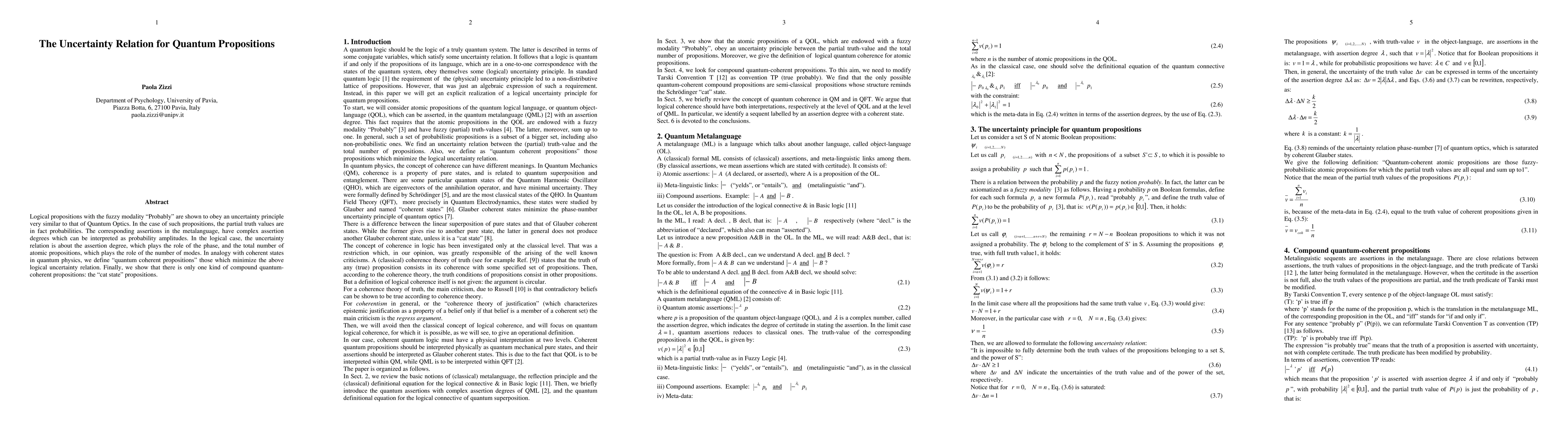 Logical propositions with the fuzzy modality "Probably" are shown to obey an uncertainty principle very similar to that of Quantum Optics. In the case of such propositions, the partial truth values are in fact probabilities. The corresponding assertions in the metalanguage, have complex assertion degrees which can be interpreted as probability amplitudes. In the logical case, the uncertainty relation is about the assertion degree, which plays the role of the phase, and the total number of atomic propositions, which plays the role of the number of modes. In analogy with coherent states in quantum physics, we define "quantum coherent propositions" those which minimize the above logical uncertainty relation. Finally, we show that there is only one kind of compound quantum-coherent propositions: the "cat state" propositions.