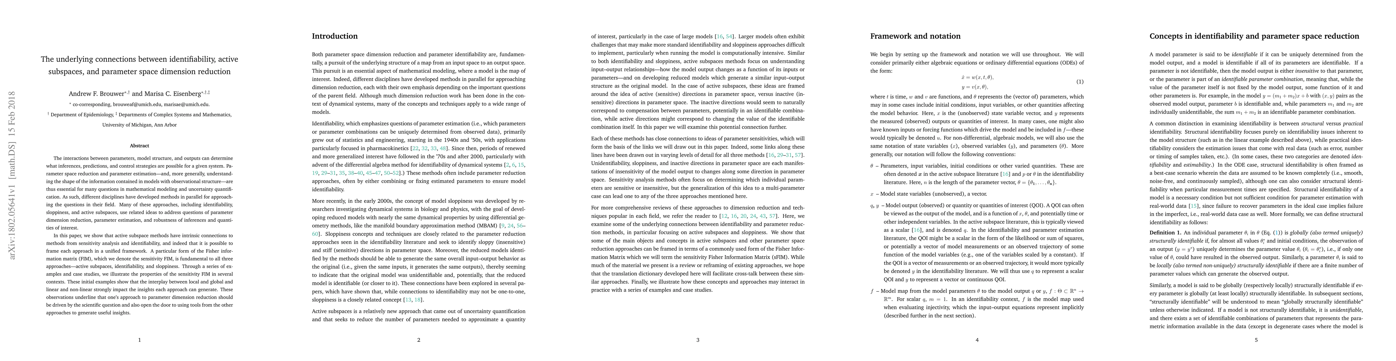 The interactions between parameters, model structure, and outputs can determine what inferences, predictions, and control strategies are possible for a given system. Parameter space reduction and parameter estimation---and, more generally, understanding the shape of the information contained in models with observational structure---are thus essential for many questions in mathematical modeling and uncertainty quantification. As such, different disciplines have developed methods in parallel for approaching the questions in their field. Many of these approaches, including identifiability, sloppiness, and active subspaces, use related ideas to address questions of parameter dimension reduction, parameter estimation, and robustness of inferences and quantities of interest. In this paper, we show that active subspace methods have intrinsic connections to methods from sensitivity analysis and identifiability, and indeed that it is possible to frame each approach in a unified framework. A particular form of the Fisher information matrix (FIM), which we denote the sensitivity FIM, is fundamental to all three approaches---active subspaces, identifiability, and sloppiness. Through a series of examples and case studies, we illustrate the properties of the sensitivity FIM in several contexts. These initial examples show that the interplay between local and global and linear and non-linear strongly impact the insights each approach can generate. These observations underline that one's approach to parameter dimension reduction should be driven by the scientific question and also open the door to using tools from the other approaches to generate useful insights.