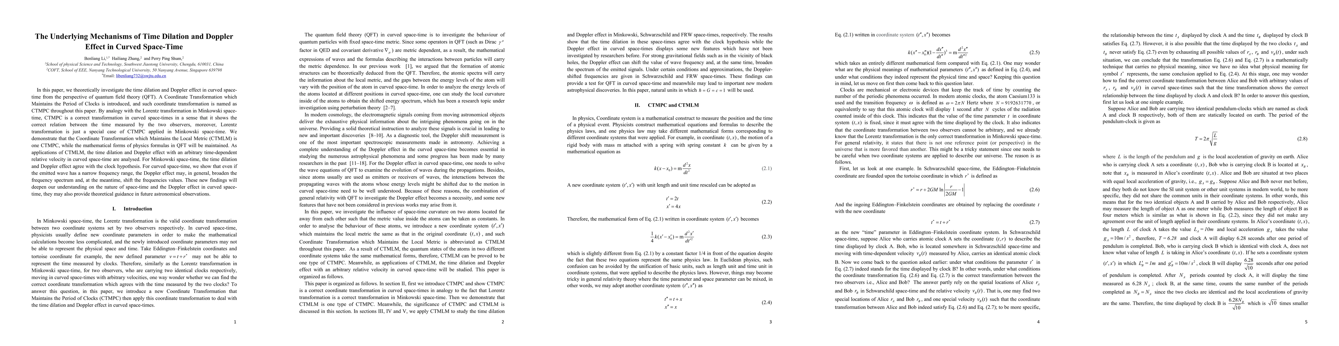 This paper explores time dilation and the Doppler effect in curved space-time using quantum field theory, introducing a Coordinate Transformation which Maintains the Period of Clocks (CTMPC). It demonstrates that the Coordinate Transformation which Maintains the Local Metric (CTMLM) maintains the mathematical form of physics formulas in QFT, and analyzes their effects in both Minkowski and curved space-time.