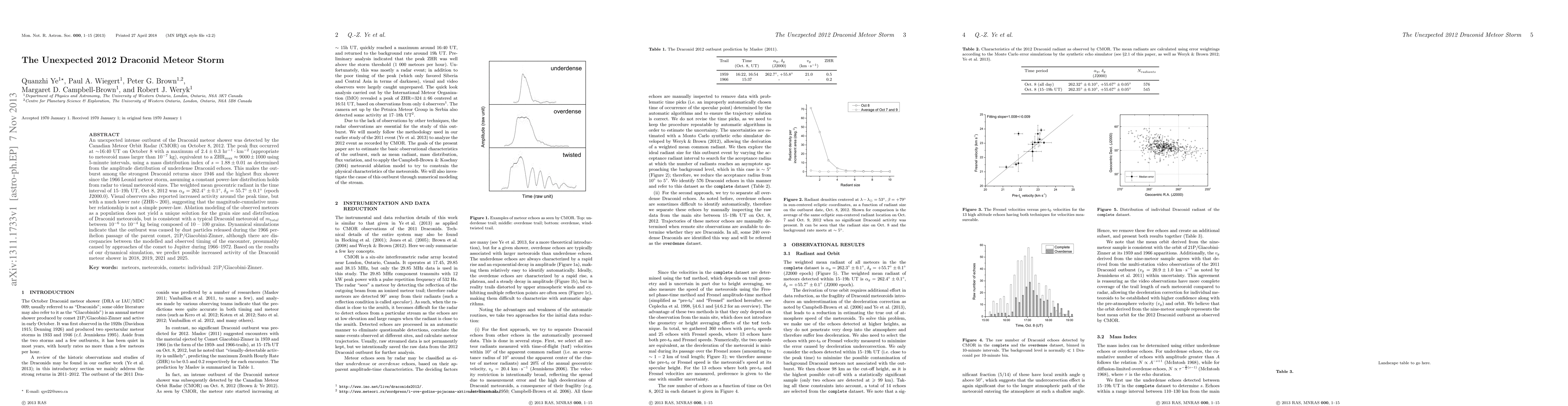 The 2012 Draconid meteor storm, detected by the Canadian Meteor Orbit Radar, peaked with a flux of 9000 meteors per hour, making it one of the strongest since 1946. The outburst was likely caused by dust from the 1966 perihelion passage of comet 21P/Giacobini-Zinner, with predictions of increased activity in 2018, 2019, 2021, and 2025.