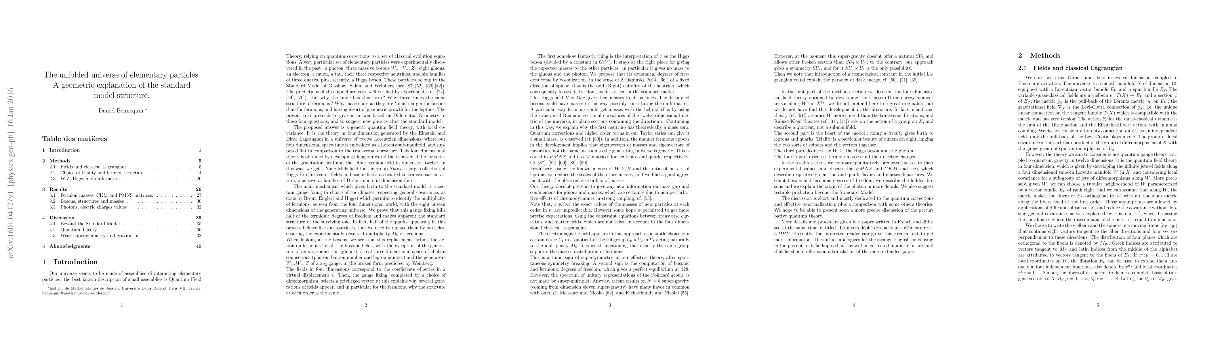 We propose a geometric explanation of the standard model of Glashow, Weinberg and Salam for the known elementary particles. Our model is a generic Quantum Field Theory in dimension four, obtained by developing along a Lorentz sub-manifold the lagrangian of Einstein and Dirac in dimension twelve. The main mechanism which gives birth to the standard model is a certain gauge fixing of triality, which permits to identify the multiplicity of fermions, as seen from the four dimensional world, with the eight unseen dimensions of the generating universe. In this way we get the known tables of particles, explaining the series of fermions and the gauge bosons. We suggest that the Higgs field dynamics could appear through a bosonization of the right handed neutrino and correspond to a displacement in the unseen dimensions. We also propose hypotheses for dark matter, and perhaps dark energy. Then we suggest predictions to go beyond the standard model.
