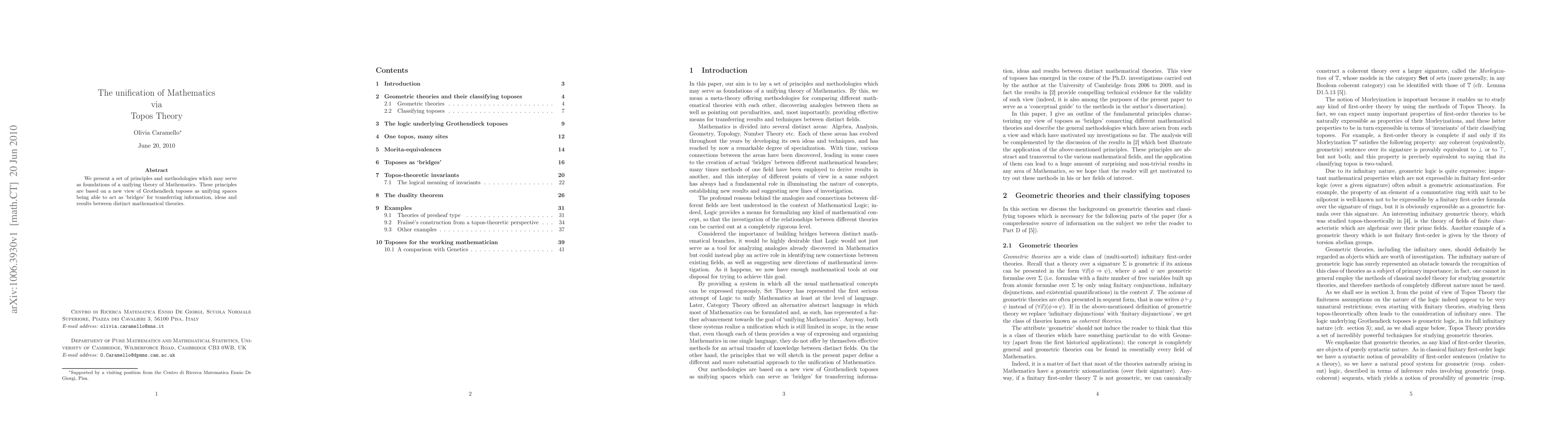 This paper proposes a unifying theory of Mathematics using Topos Theory, which views Grothendieck toposes as bridges for transferring information between distinct mathematical theories.